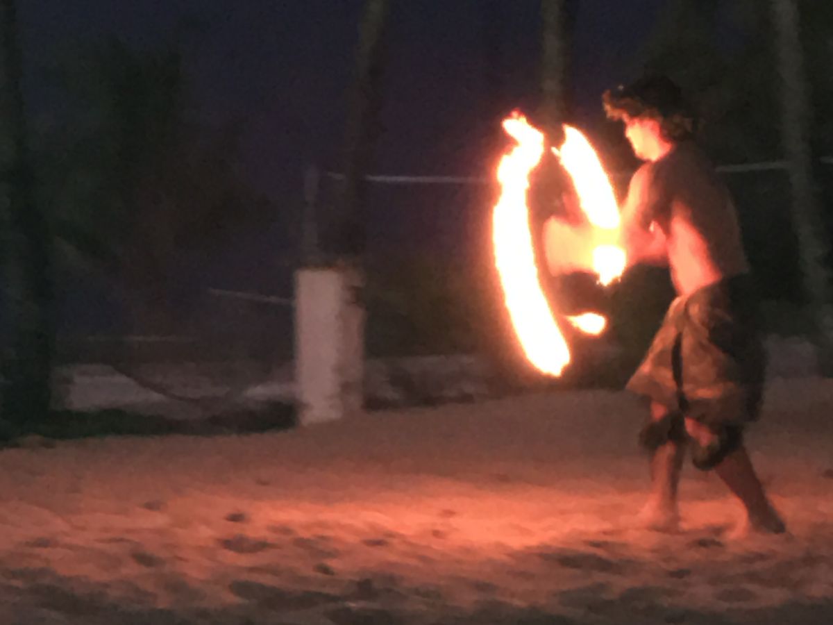 美味しそうな事前の写真に誘われて行ってみました。お店に入ると、お決まりの写真撮影。食後に売りにくるのです。15ドルね。要は紙の上に調理した具材をぶちまけて、それを豪快に手づかみで食べるという趣旨ですが、バーベキューのテーブルと同じエリアで、バーベキューの火が大丈夫なのかと思う程、各テーブルで火が上がっていて、とにかく暑くてけむい。食材が勢い良くぶちまけられて、危うくドレスにかかるところでしたよ!サイドオーダーでトリュフ塩のフライドポテトを注文したが、全くトリュフの香りもしないため、クレームで作り直しさせたりと。これならホテルのBBQの方がましかな。わざわざ足を運ぶ必要性は感じませんでしたね。食後、直接ビーチに出て散歩しました。これは気持ちよかった!