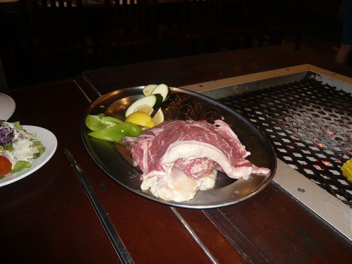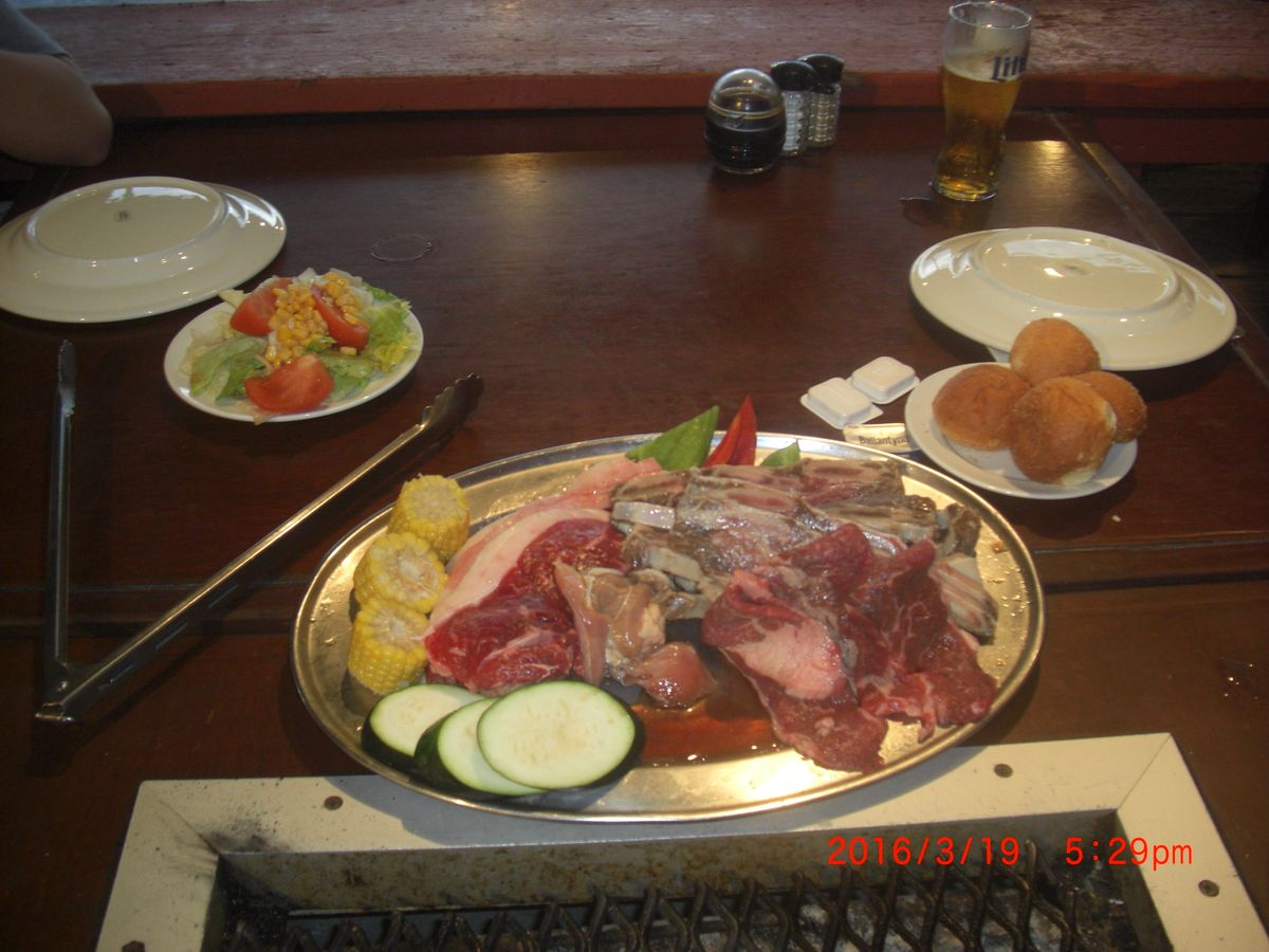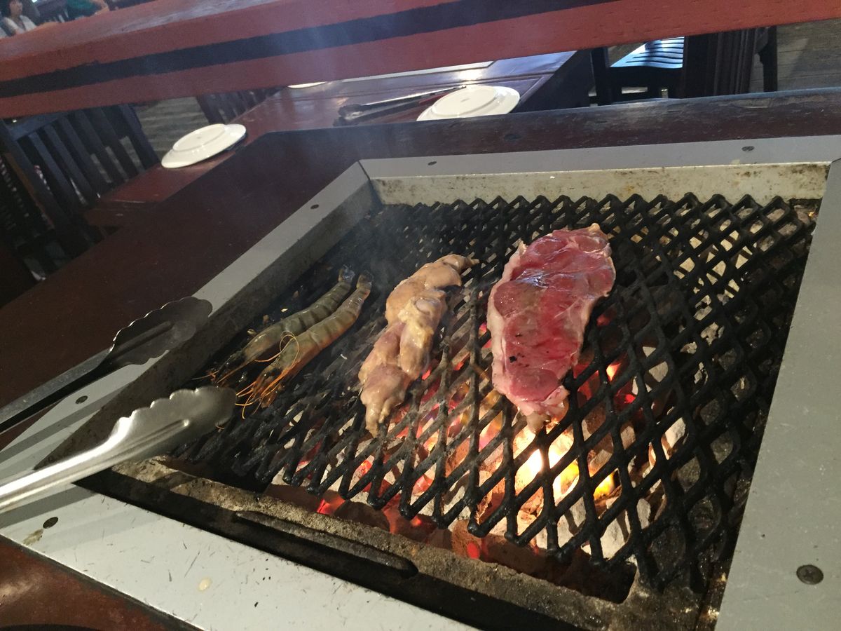 量も多く、ビーフステーキ、チキンステーキ、野菜、ロブスター、イカ、ドリンクはミラーライトで薄く物足りないですが、いいと思います。ビールはすぐに温くなるので、注意が必要でした。煙、炎もしっかりでます。ここへ行くと、身も服も洗う必要がでます。トイレが壊れていて、通り離れた、ショッピングセンターまで行くしかありませんでした。