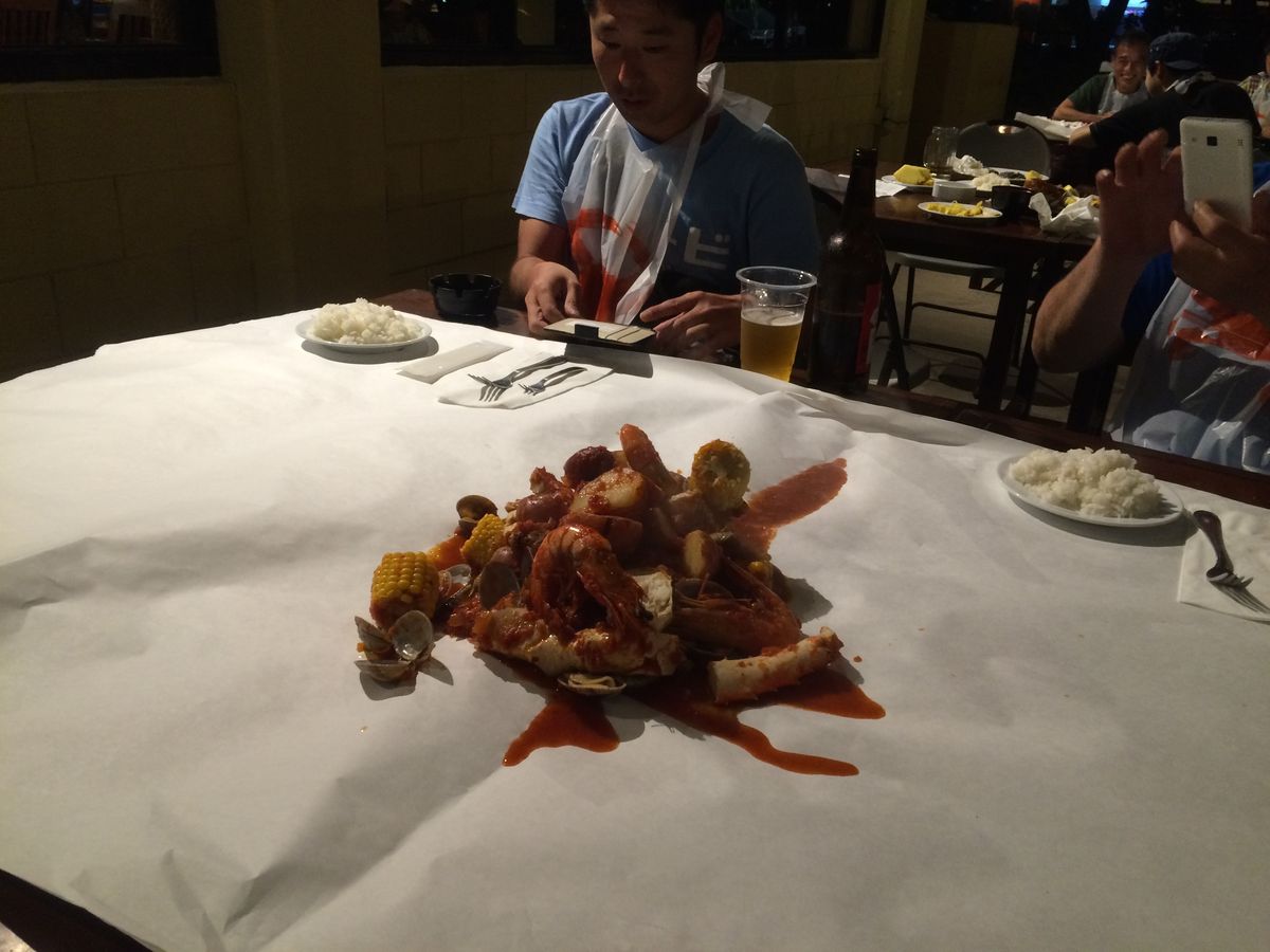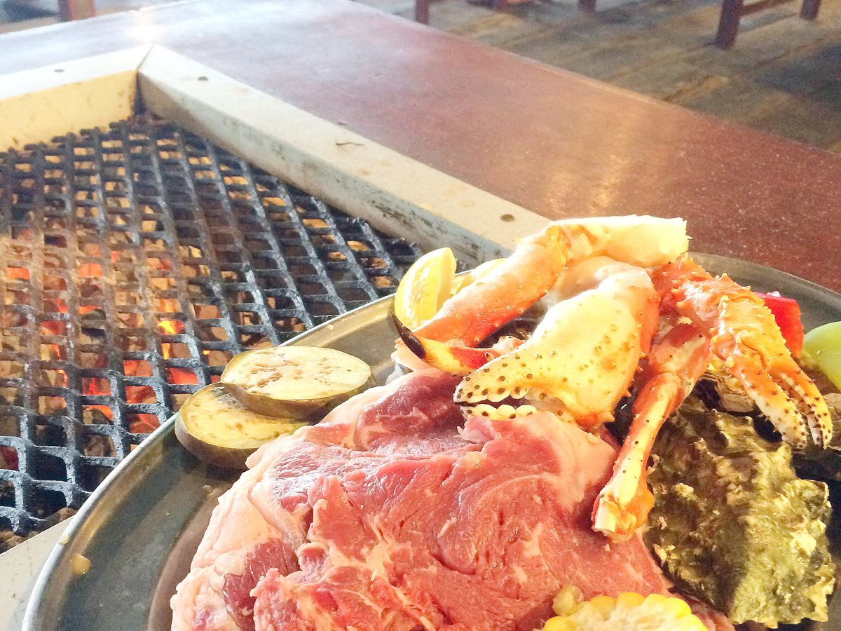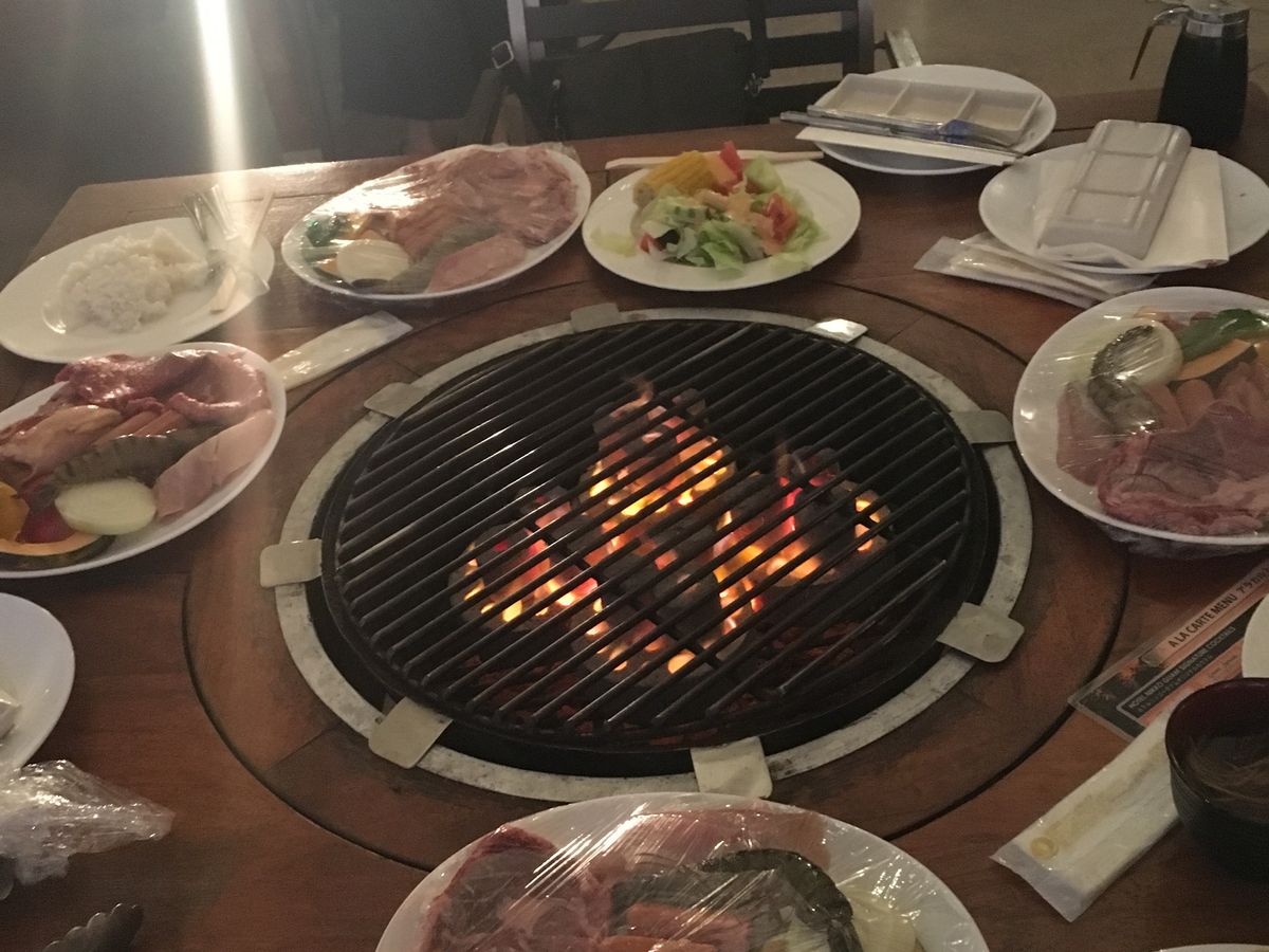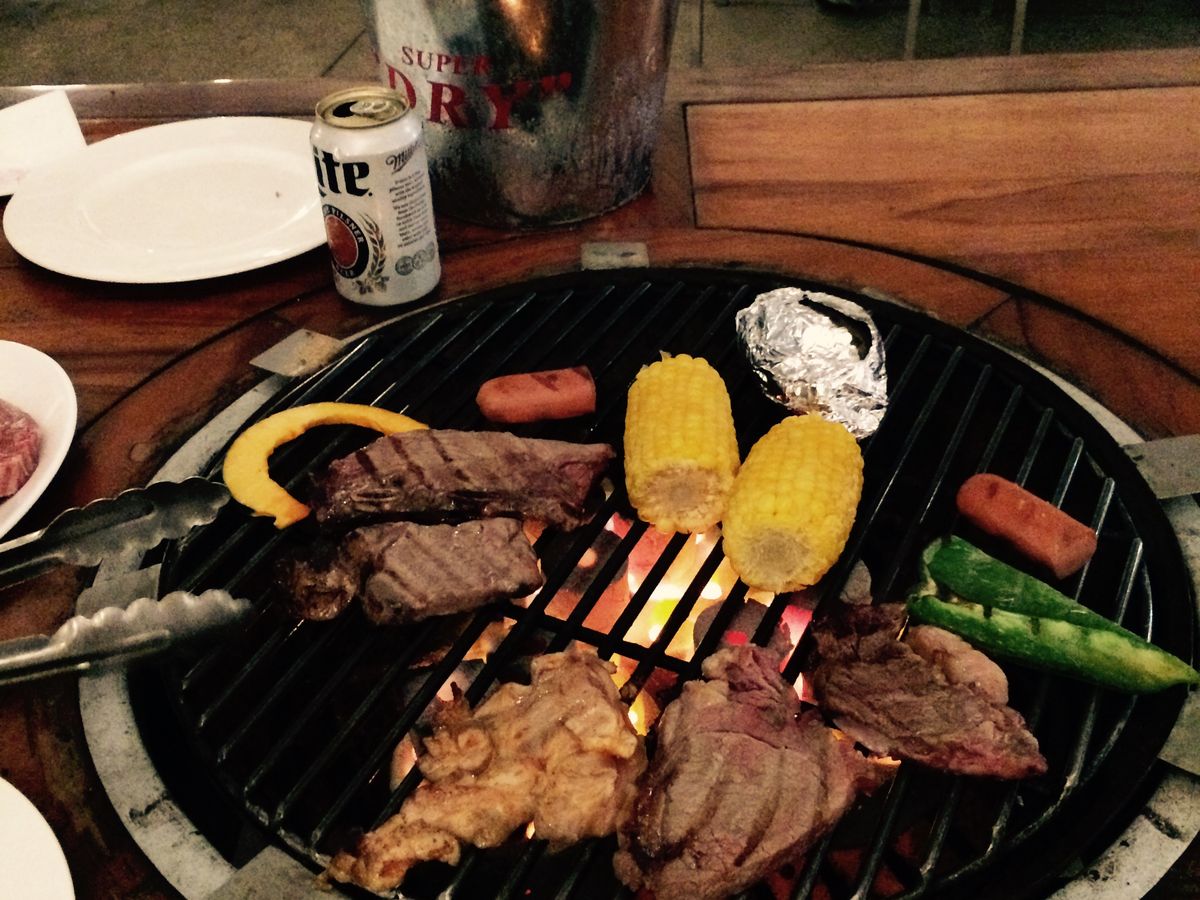 量も多く、ビーフステーキ、チキンステーキ、野菜、ロブスター、イカ、ドリンクはミラーライトで薄く物足りないですが、いいと思います。ビールはすぐに温くなるので、注意が必要でした。煙、炎もしっかりでます。ここへ行くと、身も服も洗う必要がでます。トイレが壊れていて、通り離れた、ショッピングセンターまで行くしかありませんでした。