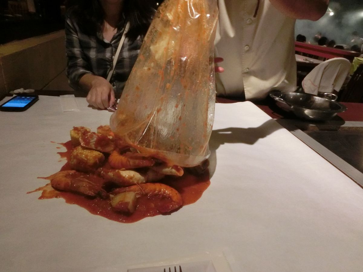 屋根付きですが屋外の場所でした。席に案内されて先に飲み物を注文しますが、席の担当は特に決まっていないようで、なんと4回も注文を取りに来ました。テーブルの上には白い紙が敷いてあります。飲み物が先に来て、しばらく待っているとビニール袋に入った料理を持ったスタッフが来て、目の前でその紙の上に料理を出して「さあどうぞ」と言われます。カニ、アサリ、エビ、トウモロコシ、ジャガイモをにんにくと唐辛子の効いたトマトソースで調理してあります。後でライスも出てきて、ライスで食べるのか~と不思議な感じでした。カニもエビも大きくて食べ応えがあります。ジャガイモ、トウモロコシ、ライスと炭水化物がたくさんあるので、お腹がいっぱいになりました。ソースが辛くてビールが進む味です。カニの殻が硬くて、なかなか割れなくて苦労していると「あれ、ハサミなかった?」といいながらスタッフがハサミを持ってきました。このハサミは良く切れるのでようやく食べやすくなった感じです。なのでテーブルに置いてない場合は催促してください(笑)。手が汚れますが、おてふきが一つしかなく、足りないので追加で持ってきてもらいました。もうちょっと料金が安くてもいいかな~と思いましたが、大きなカニとエビの材料費も高いのでしょうね。手を使って食べるのは大変ですが面白い経験でした。