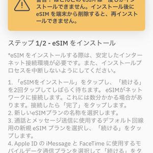 インストール途中で中断してしまって、先に進めなくなりました。チャットで相談したら、インストールはできてるとの事だったので、現地でインターネットみてましたが、本当にeSIMのでみれたのかわかりません。年配で機械に弱いので、対面で説明してくれる方がよかったと思いました。