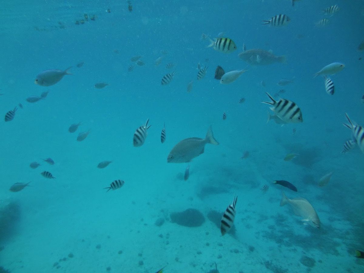 カヌメラ湾でシュノーケルをしましたが、中央の岩のまわりに魚がいました。