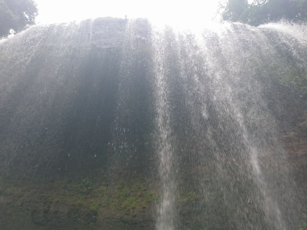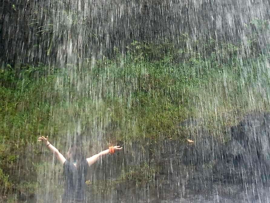 滝壺も足首上ぐらいなので泳ぐ感じではないですが、30m上から落ちてくる水で大雨に降られてる感じ。