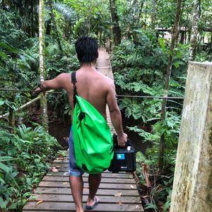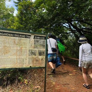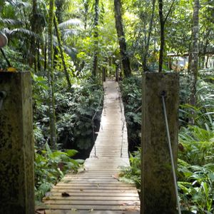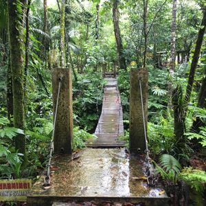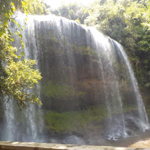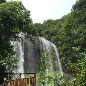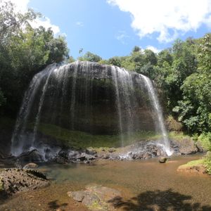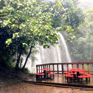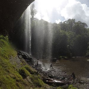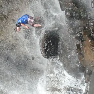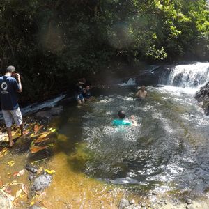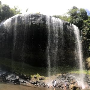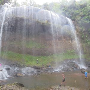 滝までの道のりは約40分間。行きは下りですぐ着いた!道中は森をくぐる道で蛇が現れたり、毒があるという木にも遭遇。トロッコ道を歩いたり、大きな川があるところを通ったり、大自然の中を進んでいき、小さめのつり橋を渡るとすぐ大きな滝が現れた。私たちが行った時の滝は水量がそんなに多くなかったそうだが、それでも圧巻。天気も快晴で、近づくと近くには虹ができていてとてもきれいで感動した。滝つぼは浅く、また、滝裏へも簡単に登っていくことができ、滝裏からの景色も素晴らしかった。有名な世界の絶景の写真で見たことあるような気がした。ひとしきり滝で遊んだあとは復路へ。これが行きとは違い登りで少しきつかった。途中の川で遊びながら休憩。なんとかスタート地点に戻ってきた。