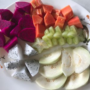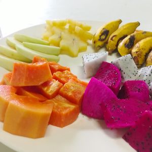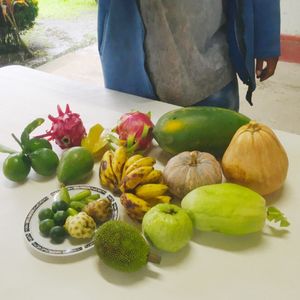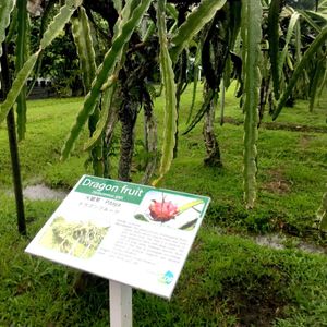 果樹園では、バナナの木やドラゴンフルーツの木などを