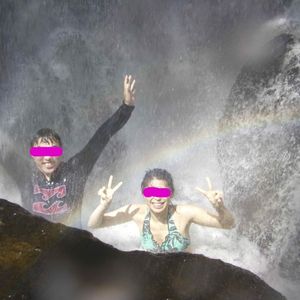 川を渡ったり、池に飛び込んだり、テンションあがりまくりです。そうしてたどり着いた滝は圧巻の迫力&美しさ!滝壺が浅いので滝の真下に入れるのもおもしろいですよ。