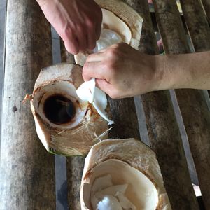 ココナッツジュースをもらうと思っていたのですが、ココナッツのお刺身が出てきました。わさび醤油で食べて、意外においしかったです。