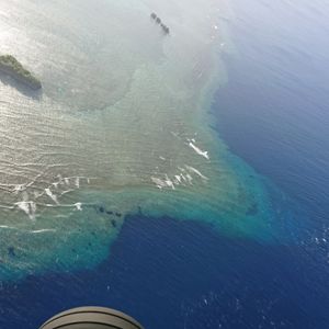 さて、天候ですが、離陸直前にまさかのスコールがありましたが、飛行中はなんとか曇りまで回復。快晴時ほどの青い海ではないと思うが、高度が高くないので、地上や海の中は十分に透けてみえました。ドアなしなので、調子にのって窓の外に手を少し出そうとしたら、やはりすごい風圧でした。これから体験される皆様はお気を付けください。