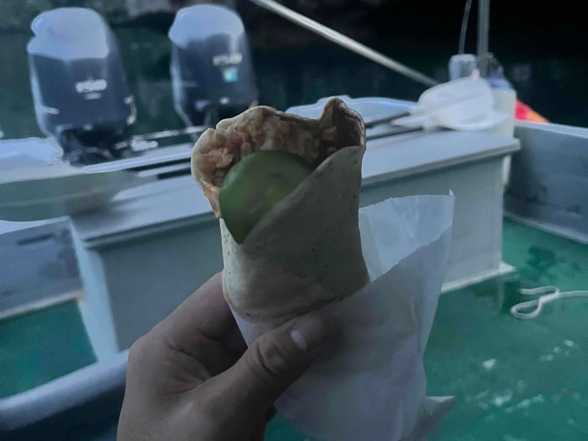パラオの大自然を楽しんだ後は船の上で温かい日本茶と、この日はチキンラップで軽食タイムを挟みます。しっかりおいしくて量もありました。