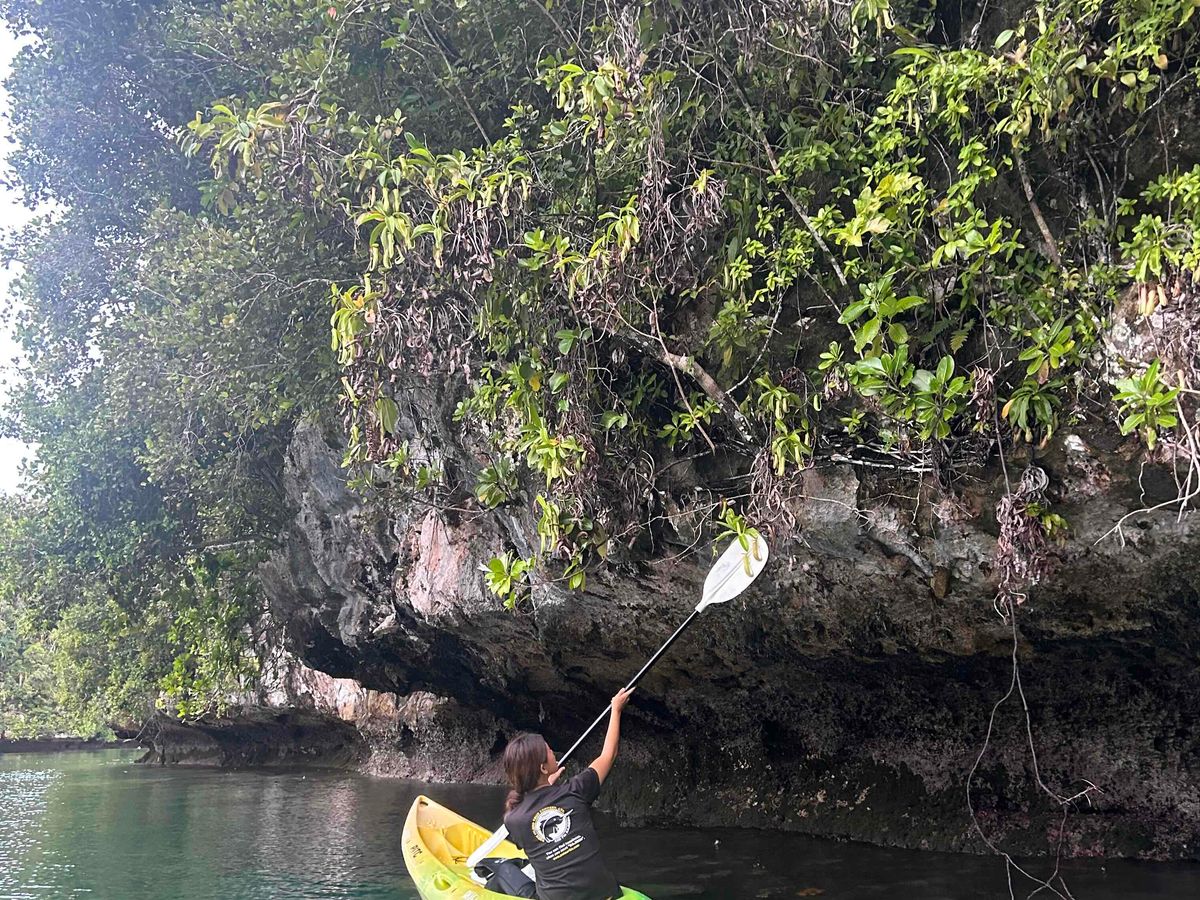 雨季でしたが、雨も上がり削られた島の淵から雨水が滴るポタポタという音と鳥やカエルのきれいな鳴き声、私たちのカヤックを漕ぐ音、YouTubeの中の癒しの音楽でしか聴いたことがなかったようなな、何とも言えないすてきな音ときれいな景色に浄化されます。ミナミさんが自生しているノニやウツボカズラやパラオのお花ビッキア・パラウエンシスを見つけて教えてくれるのもとても楽しめました。