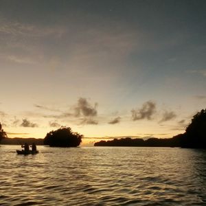 ライフジャケットを受け取り乗船する。荷物を入れる防水バッグも貸してくれた。少し走ったところでカヤックに移る。太陽が島影に落ちようとしている、まさに写真撮影のタイミング。バッグからカメラを出し撮影。ガイドさんにも撮ってもらった。日が落ち、星が見えて来た。カヤックに寝そべり、星空を見上げる。近眼なのが残念。船に戻り軽食を食べる。私はサンドイッチ、と言っても鳥の唐揚げとサラダがついている。ガイドの青年はパラオにきて三年、お兄さんもダイビングショプで働いている。日本でサラリーマンをしていたが、パラオが良いと決めたそうだ。船の前に行き、ガラスに寄りかかって星空を見上げる。衛星が見えたそうだが、私は確認できなかった。残念。シュノーケルマスクをつけ、海へ。夜光虫が見えるという。マスクをつけた顔を水中に入れ、手足を動かすときらきら光るのが見える。初めての体験。やや感動的。船に戻り、カヤックに。真っ暗で、月の明かりのみの海を進む。ガイドの案内で島影を進むと浅い池のような場所へ。周りは森で囲まれ池の中にいるよう。水深もオールで探ると50cmほど。メンバーも静かに静寂を味わっていた。忘れられない思い出となった。