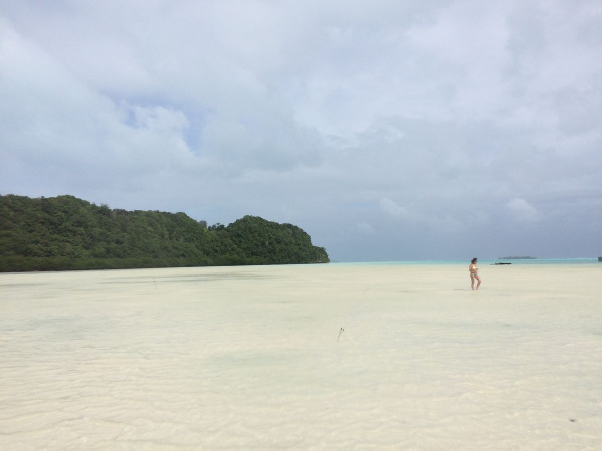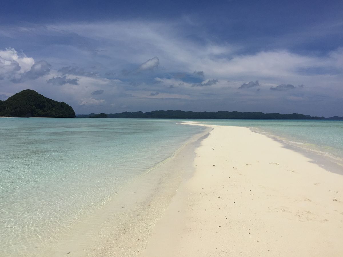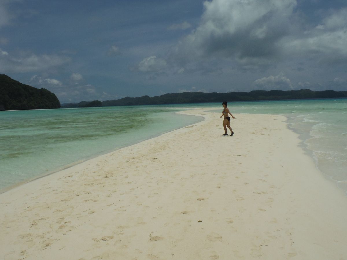 ボートに乗って島の先端から45分先にある無人島へさあ出発。朝から曇り空で不安が的中し、途中大海原の真ん中で大雨に打たれ雨合羽を貸してもらったものの、しぶきと雨でびっしょぬれになりました。 しかし雨雲を通りぬけるとぴたっと雨もやみ、釣りを楽しみ3匹も釣れました。 無人島に到着したら晴れてきて おかげでここは天国かと思うくらいのなが~く続く白いビーチが干潮とともに海の中に現れて駆け足で走って大はしゃぎしました。 神様ありがとう 早くもこんなに美しい天国を見た気持ちになりました。 パラオって美しい!