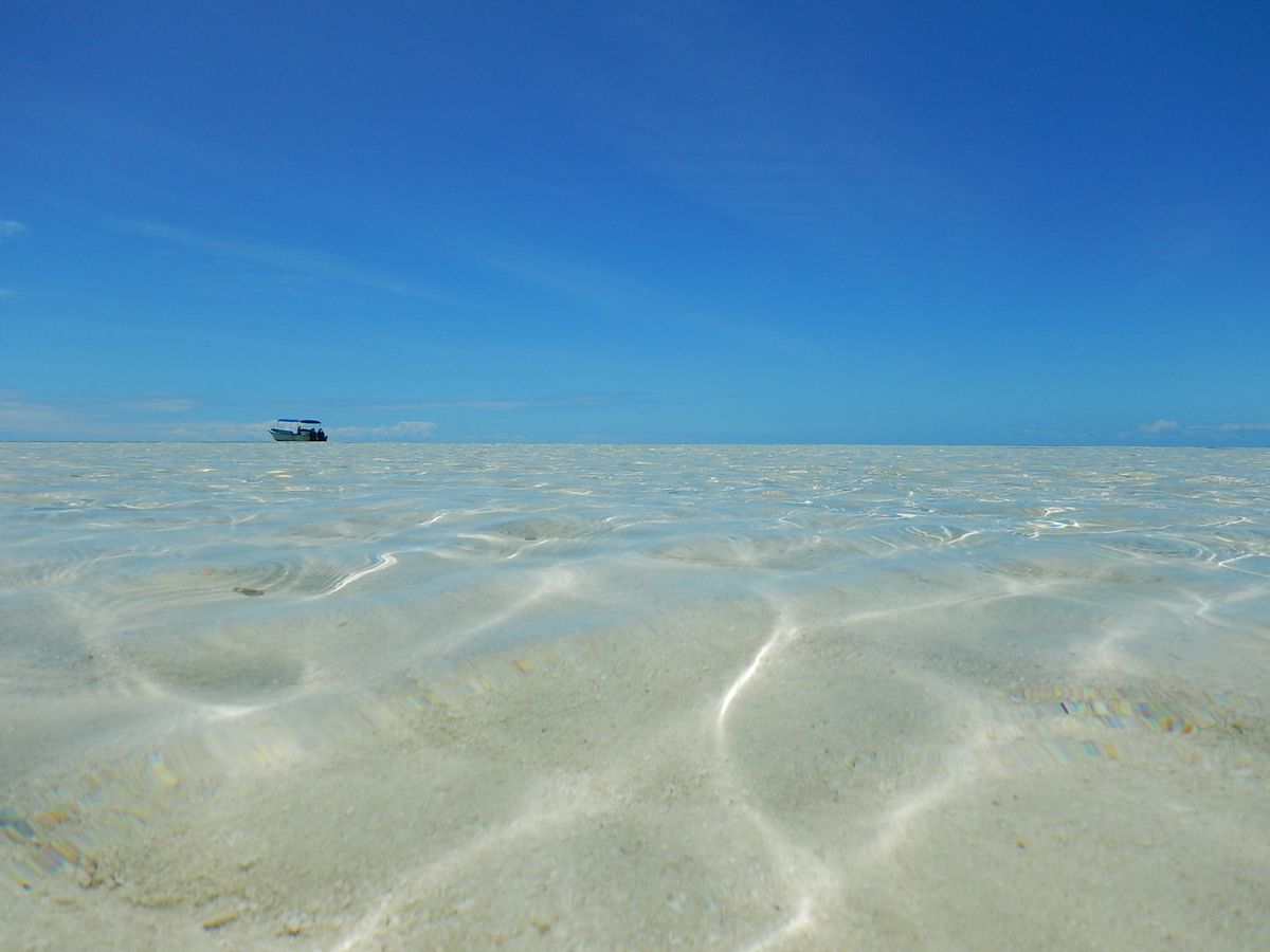 無人島でお弁当を食べた後、本日のメインイベントのロングビーチへ。船で近付くと、海の真ん中に白っぽい道のようなものが見えます。