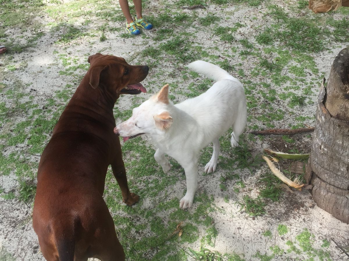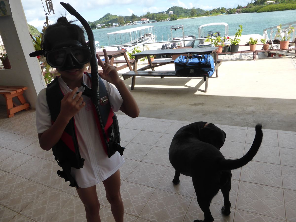 島には放し飼いの犬が2頭おり、私たちが到着時は砂浜に寝ていたのですが、ランチタイムになるとちゃっかり私たちの周りを徘徊しておこぼれをいただいていました。