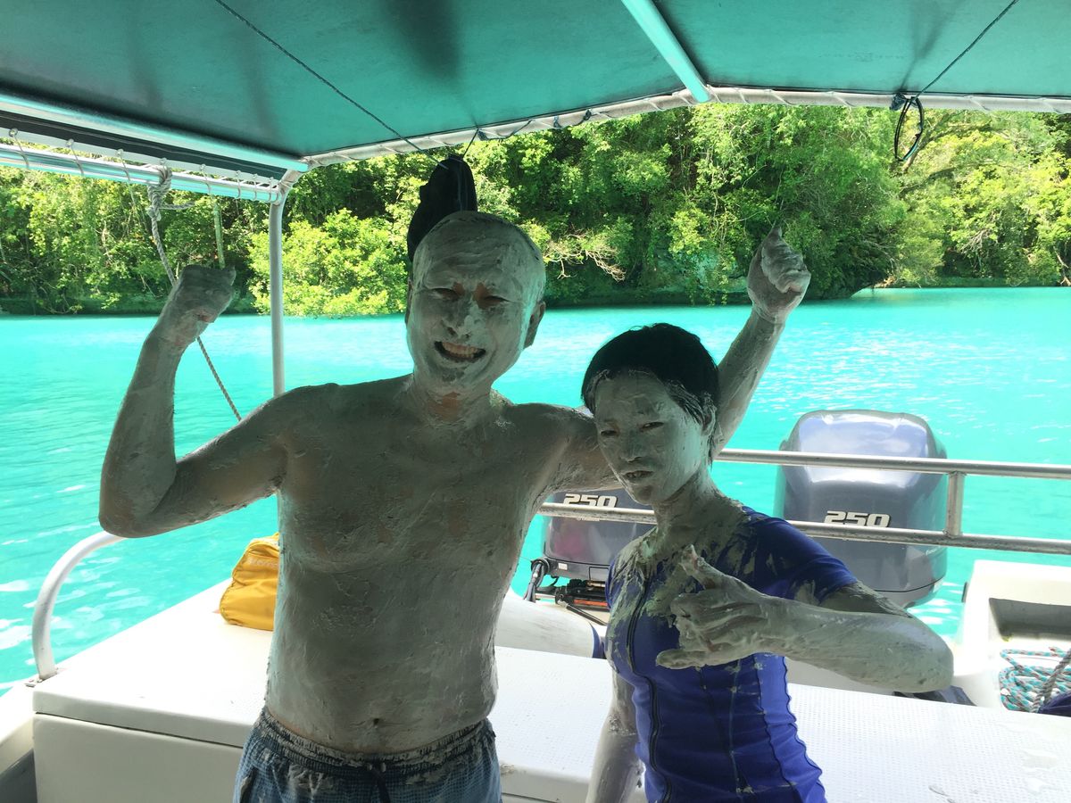 初めに立ち寄ったミルキーウエーでは、エメラルドグリーンの入り江に船が入り、スタッフが潜って海底から取ってきた泥を、船上で参加者同士が童心に帰って顔や体にその泥を塗りたくりました。セメントのような感触で乾くと石膏の人形のようになり、お互いの姿を見て大笑い。ガイドさんがベストショット??を取ってくれました。