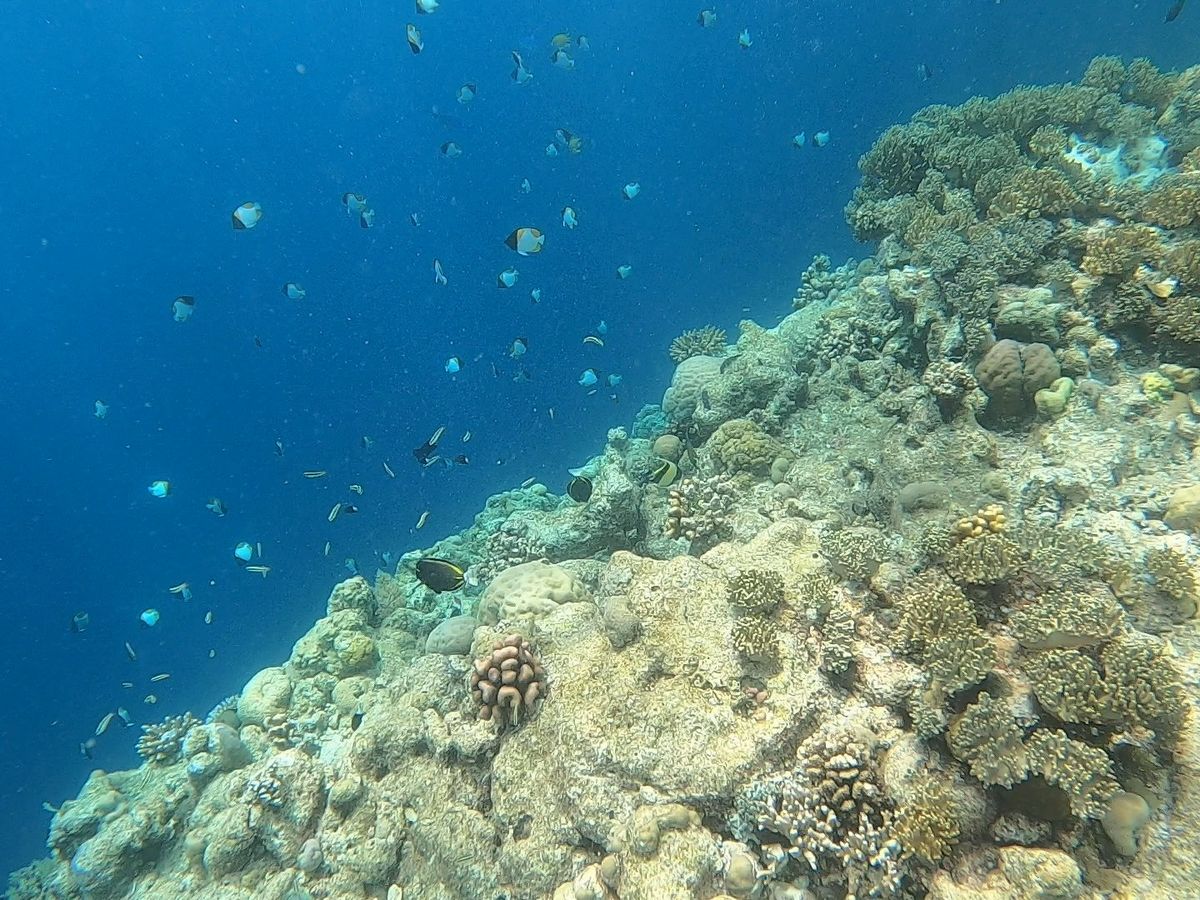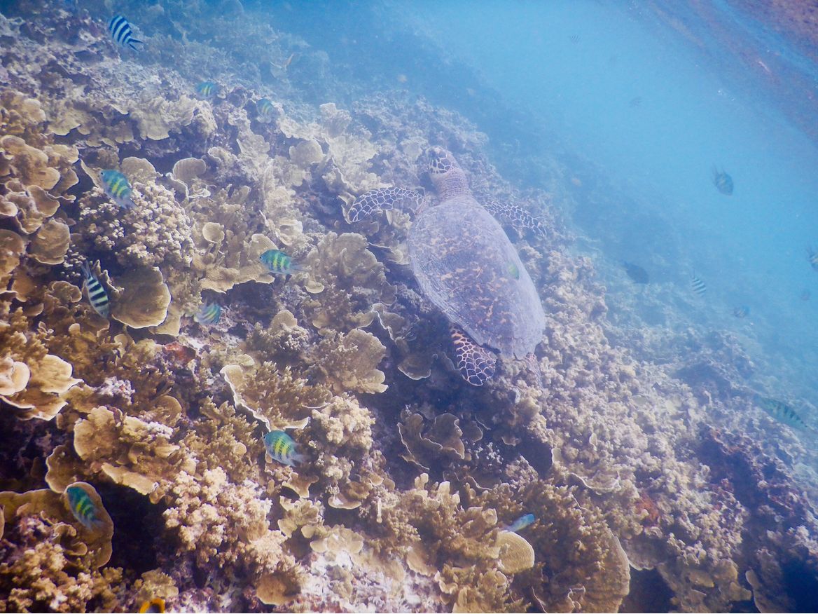 幸運なことに天候にも恵まれ、「ビッグドロップオフ」というダイビングポイントでシュノーケリングができました!たぶん水深15mくらいの珊瑚礁から、急に何百mと深くなっている境目を30分ほどシュノーケリング。色とりどりの珊瑚と熱帯魚、そして海亀やナポレオンフィッシュに出会え、忘れられない体験になりました。