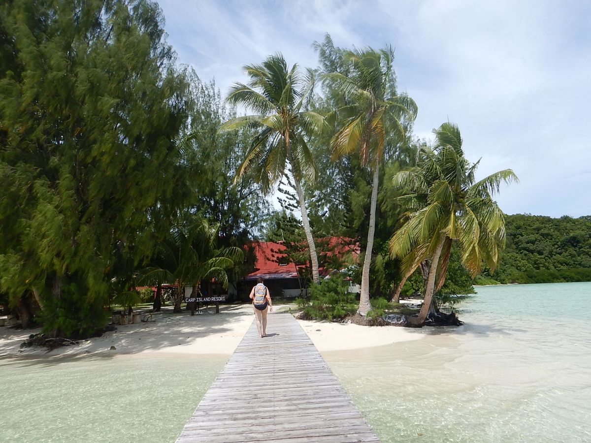そこからバスに乗り換え一時間位走って桟橋到着。ここからはボートに乗り込みます。無人島迄は約一時間だとか。移動だけで片道2時間。まずは、ポイントに立ち寄り、シュノーケリングをします。結構深い場所で波も結構ありました。アンデイ(ガイドさん)が、ボディーボードを浮かべて誘導してくれたので、初めての人でも安心です。新婚さんの若い彼女も怖がってたけど、いざ飛び込んだら《綺麗!サイコー!!》と叫んでました。色とりどりのサンゴ礁!その合間に色々な可愛いお魚たち。凄くでっかいシャコ貝!アンデイが潜って優しくチョンチョンと触ると、ふにゅ〜ってとじます(^^)。大きなナポレオンフィッシュもいました。アンデイが、バブルも作ってくれました。よくイルカがやってくれるやつです!本当に楽しめました。そこからまた船に乗り、手釣り体験!アンデイが一番初めにでかい魚釣ってくれました。残念ながら私はつれませんでしたが、、。新婚若妻ちゃんが船酔いになった時、素早くお水を持ってきて背中をさすってくれたり、本当に気の配り用に拍手を送りたい位でした。次は島を目指します。海の色が段々変化しました。無人島では釣った魚をさばいてくれました。とても美味しかった♡。その次は、人が住んでる島に上がって、バナナ食べたりコウモリやヤシガニ見たり、色々な植物の説明しながら散歩しました。こんなに時間を掛けて迄もこの場所に来た甲斐はあります!景色もガイドさんのアンデイも最高でした!またもう一度来ようと思いました!その時もアンデイのガイドがいいな♡有難う御座いました。
