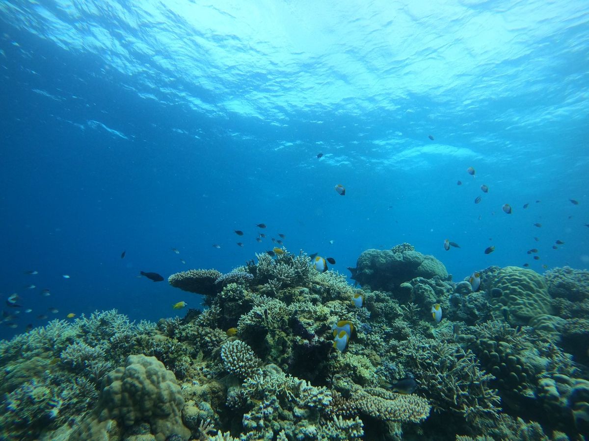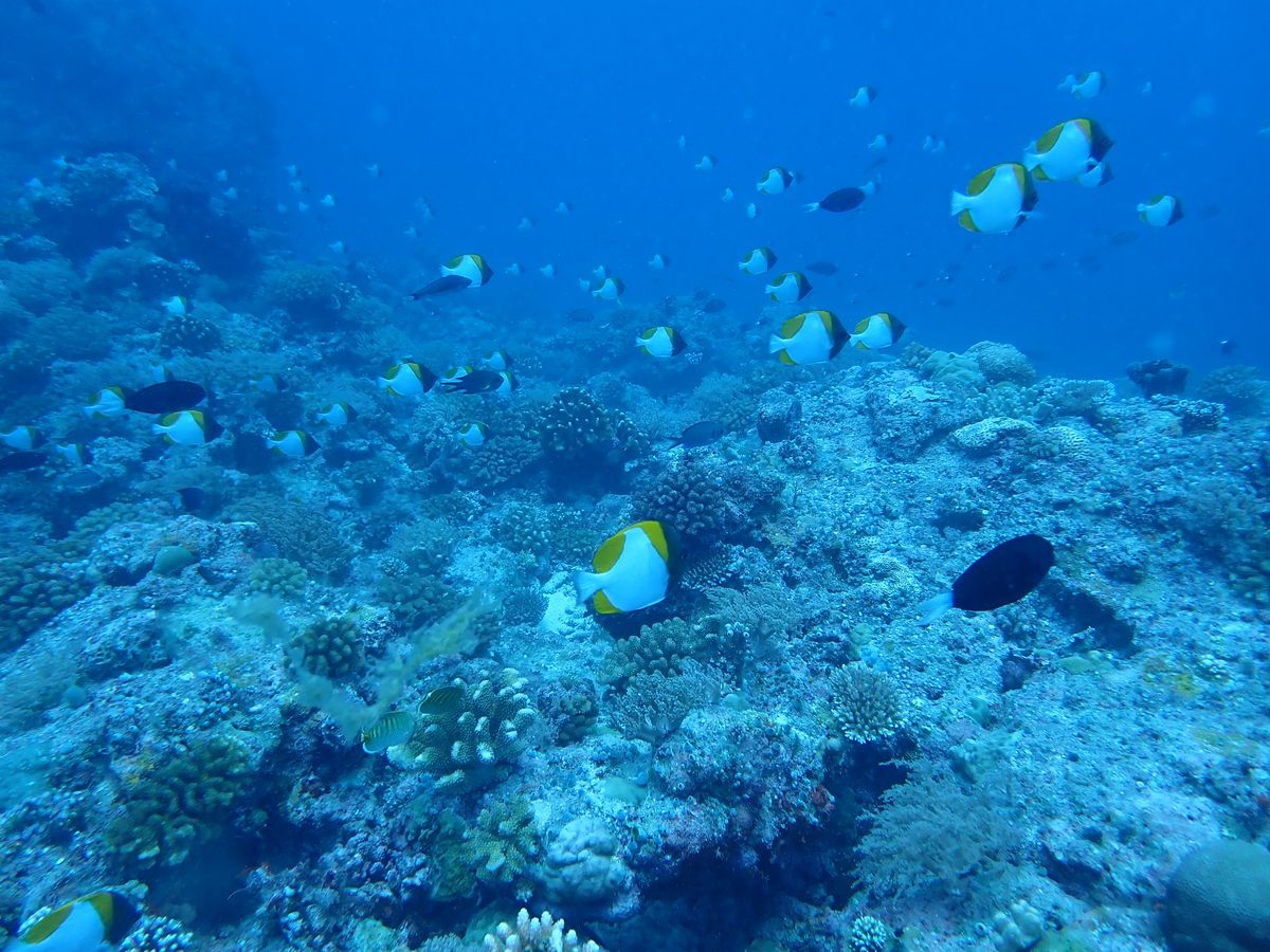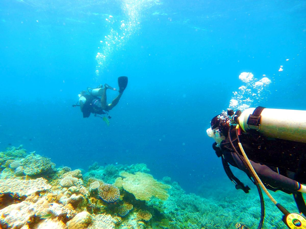 本島から少し離れた場所でダイビングを行い、大変綺麗なサンゴ礁と魚たち、