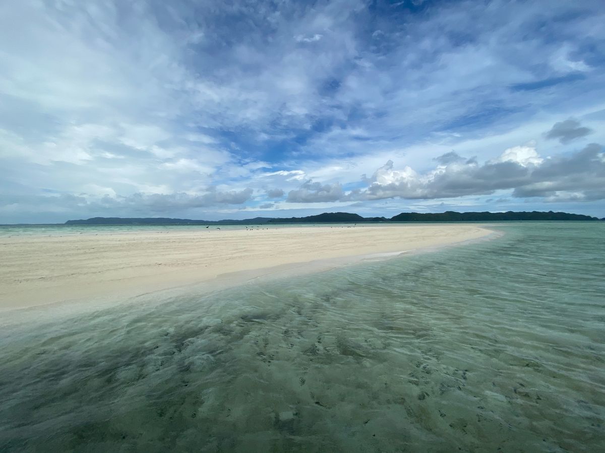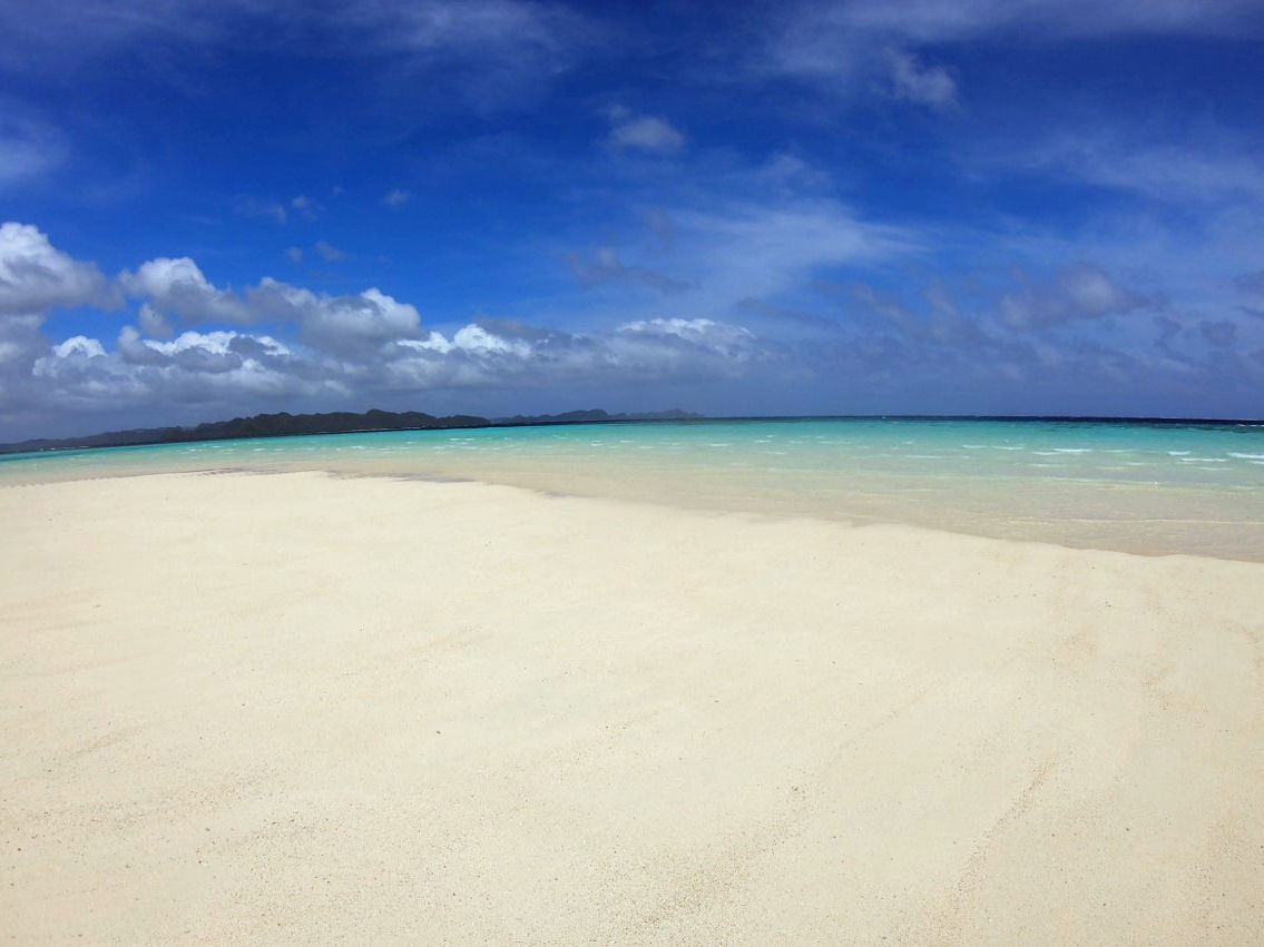 「こんなところに!?」と驚く沖合に、綺麗なサンドバーが突如現れ、二人で感動!しかも、誰もおらず、終始貸し切り。