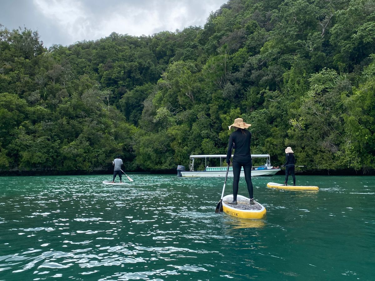 その後はマングローブ生茂る場所まで船で移動し、そこでサップボートに挑戦!人数分のボードがなかったので、わたしと相方は2人乗り!相方は経験が無く、不安定で今にも落ちそうでヒヤヒヤしましたw そんなこんなでガイドさんの後に続いて、みんなでマングローブの間を潜り抜け、神秘的な風景に感動しました。途中洞窟を見つけ、ガイドさんから防空壕の跡だよと言われました。少しひんやり。。。綺麗な海で囲まれたパラオの歴史を少し感じられたような気がしました✨サップボート中、ガイドさんが岩場でガサガサゴソゴソ何かしていると思ったら、国花を摘んできて女性にプレゼントしてくれました♡海外ならではのジェントルマン✨イケメンでした!