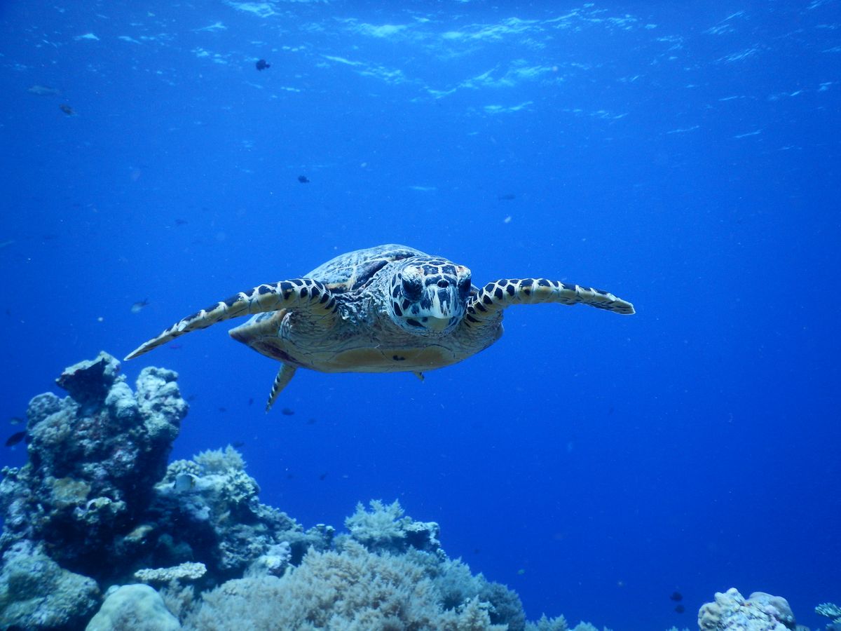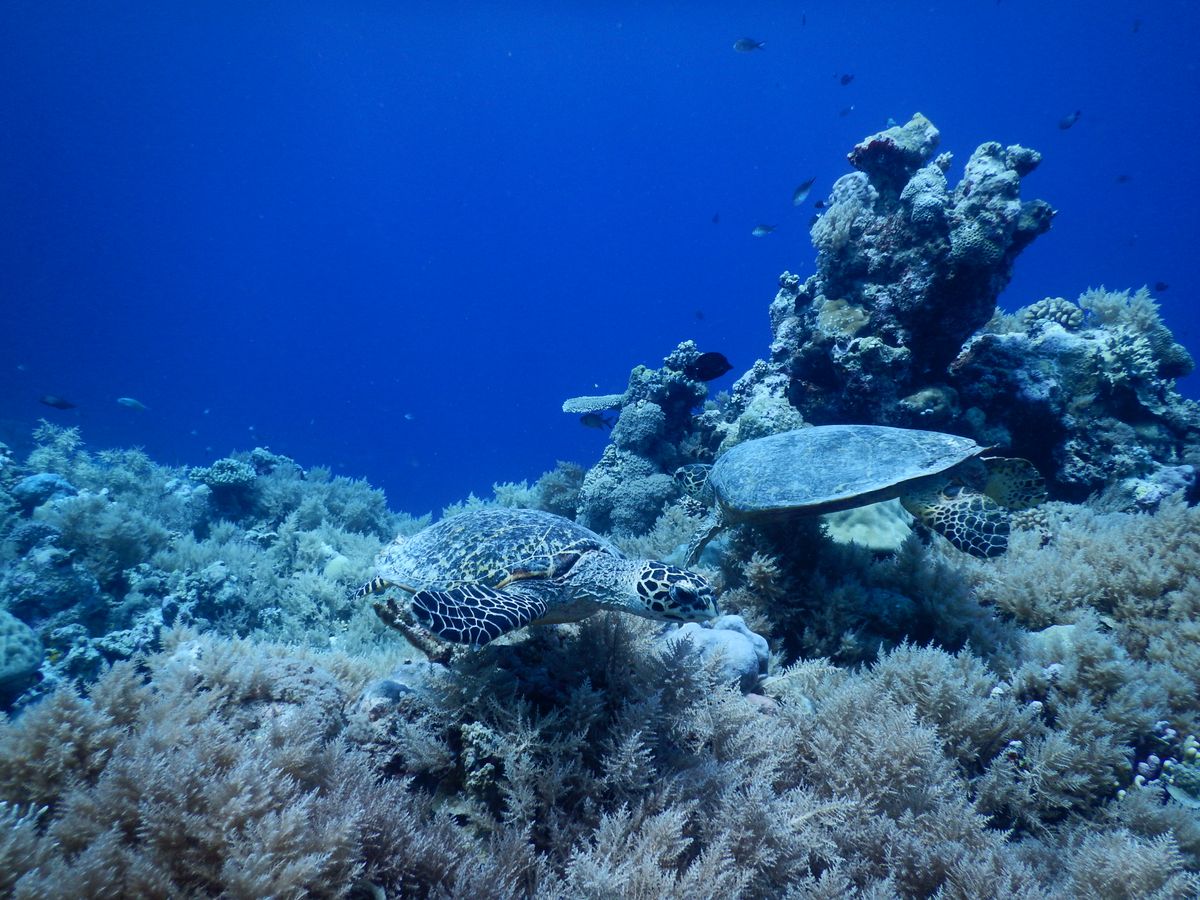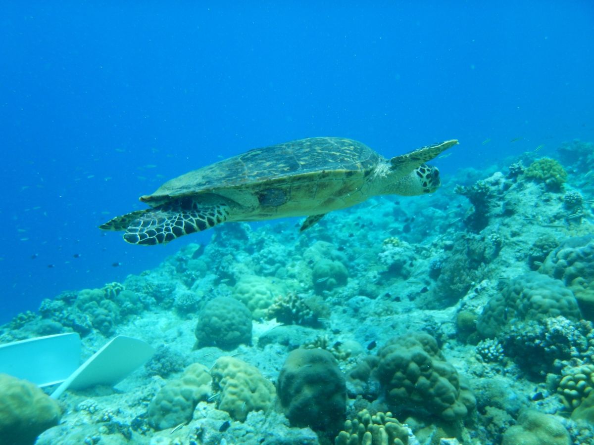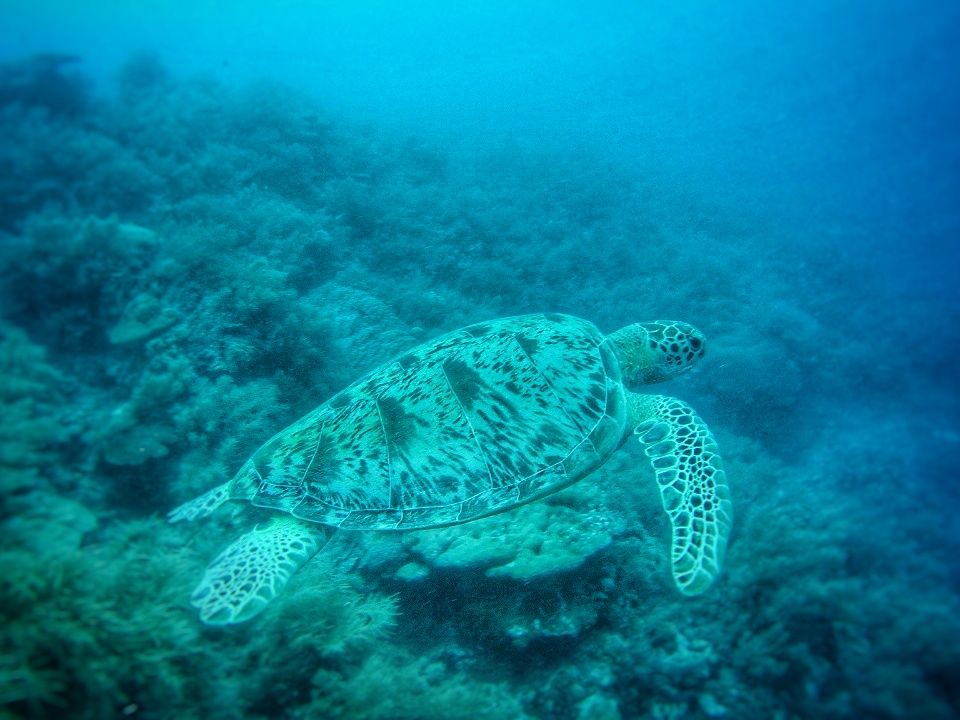 水中でバレーボールプレーヤーさながらのプレーをしたり、タイマイ(カメ)をみんなで見たり