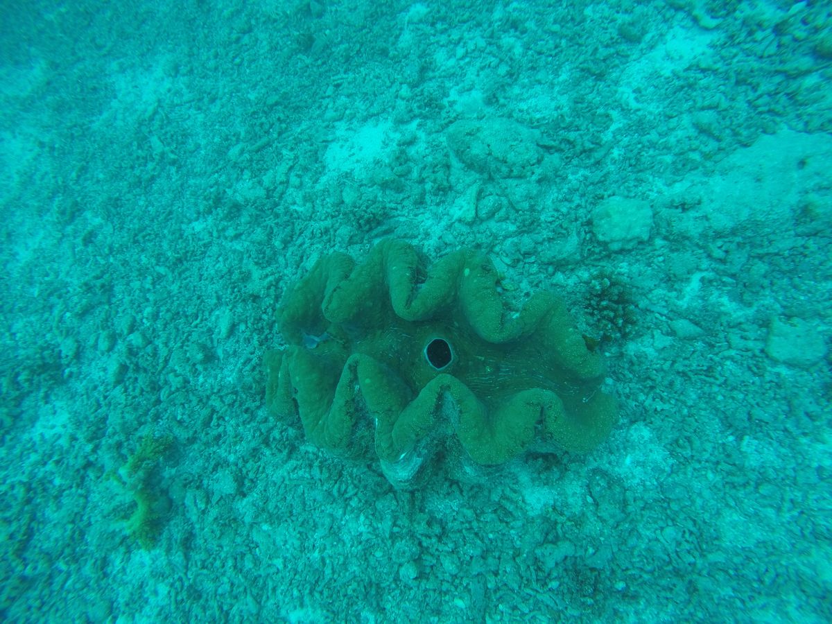 珊瑚に頭を突っ込んで食事中。大シャコガイ!!大きな水管に手をかざすとすごい水流を感じることができます。おいしそう~