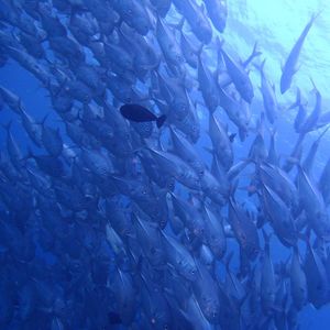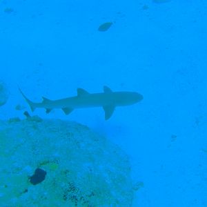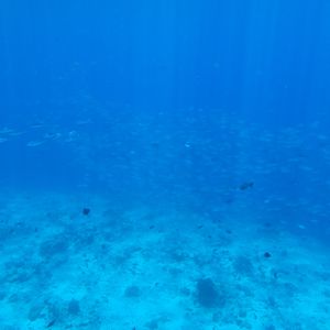 水中での呼吸に慣れるための水面でレギュレーターを加えて練習していると目の前にギンガメが群れていました。ナポレオンを少し遠目ですが見れました。ホワイトチップも底でお休みしている所が見れました。全然色を変えない、ホウセキキントキの群れにも会いました。
