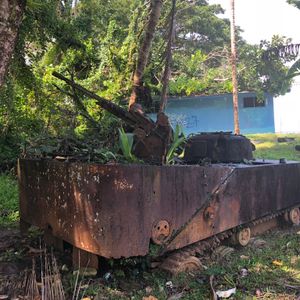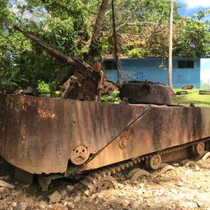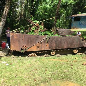 途中、ぬかるみに嵌まってしまったり、ハンドルを取られて脱輪しかけたりして、大笑いしながらひたすらジャングルをドライブしました。戦争で捨て置かれたままの錆びた戦車にも立ち寄ります。