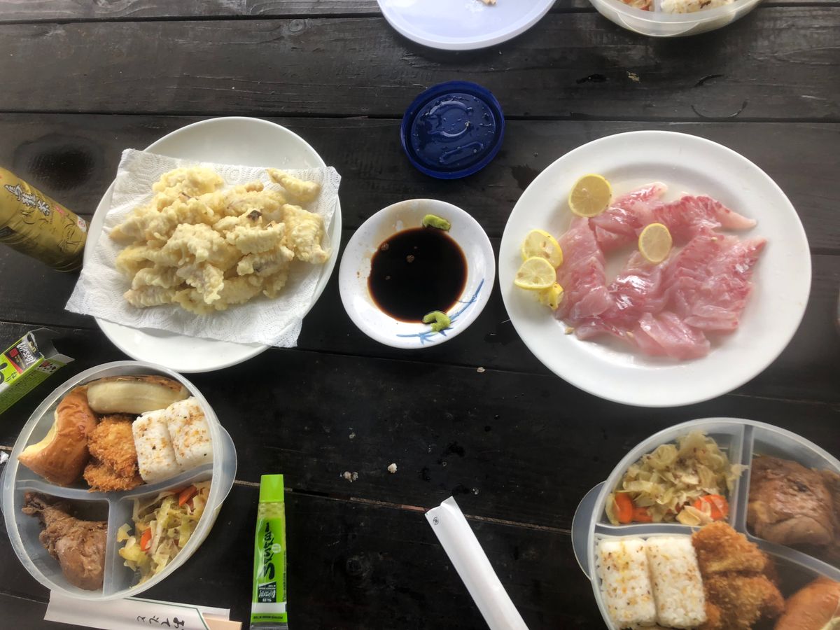 上陸してもドシャ降りの中、船長&スタッフで頑張って刺身や唐揚げを作ってくれました。