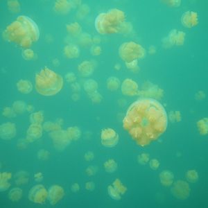 オレンジ色のかわいいクラゲと一緒におよげて、たのしかったです。サカナの群れやカメとはまたちがった風景で、貴重な思い出となりました。10年前くらいにきたときはエルニーニョの影響で茶色く弱った弱々しいクラゲがぱらぱらいたのですが、湖がきれいになり元気な可愛いクラゲでいっぱいになってました。