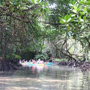 カヤックでは野鳥の鳴き声を聞きながらマングローブの中を進み、2人1組みで漕いで行きます。カヤックでの移動中マダラトビエイが身体を休めるために現れたりしました。