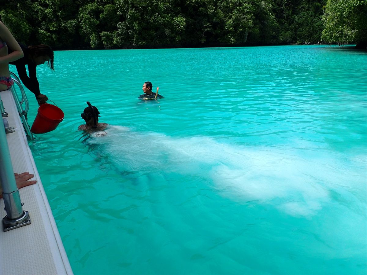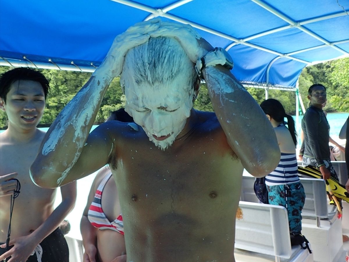 海が荒れていた関係でボートが東側の海を通過できずに、スケジュール順が逆さまになりました。でも、実はこれが嬉しかったのです。このツアーに参加したのがパラオ2日目、ほとんど日焼けをしていないので、ツアーの最初の方でミルキーウェイの泥パックをしたのではあまり効果がないなぁーと思っていました。しかし、スケジュールの逆転により泥パックがツアーの最後となり、一日の日焼けを抑える効果があったのでは…!?