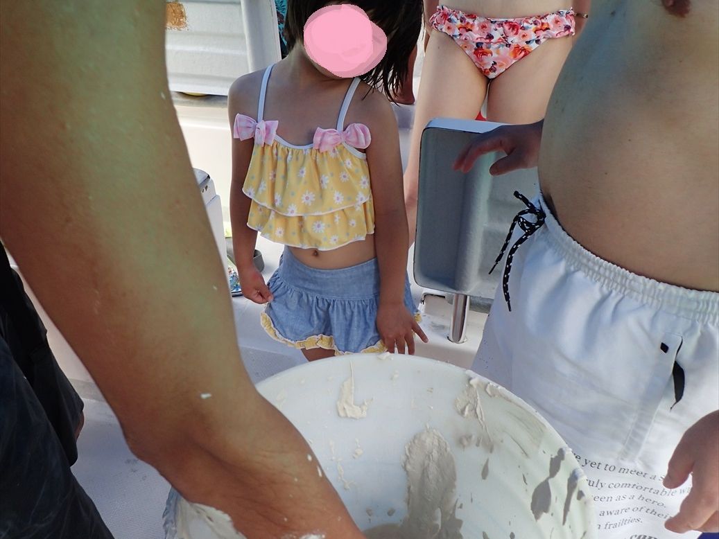 バケツの泥を各自全身に塗り、泥を落とすために、船から飛び込む人、はしごで降りる人などいます。