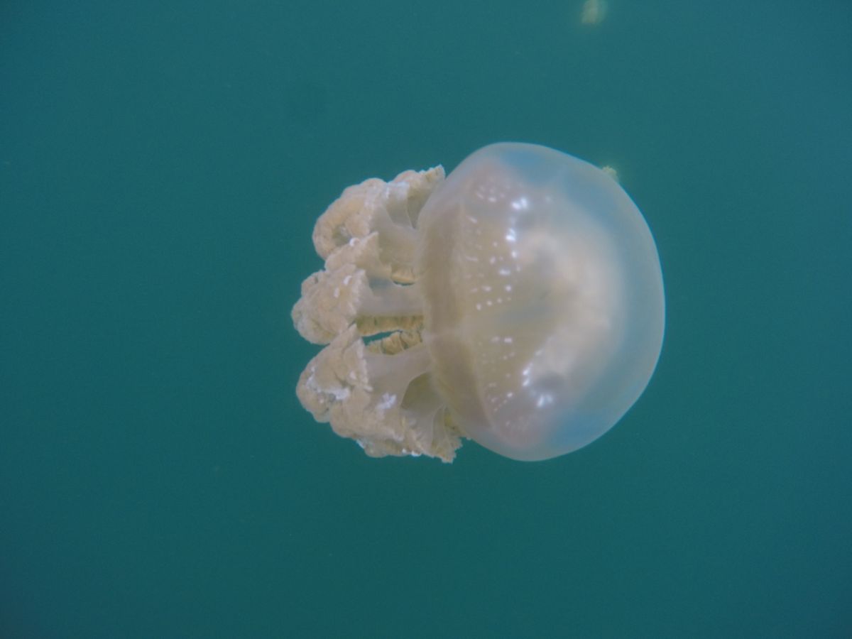 ずっと昔TVで観て、憧れていたジェリーフィッシュレイク♪しかし、その体験は体力との勝負で始まりました。ボートから下船すると急な坂道を上って上って下がって下がって、湖に到着。そこで既に足に笑いが起き始めていたのに、いざ湖に入水するも、ジェリーフィッシュは湖の反対側に多く生息しているとのこと。その感動をより味わうために、水面を視界に入れない“らっこちゃん泳ぎ”(仰向け)で移動しましょうとのアドバイスから500mをひたすらバシャバシャ腕を使って進んでいきました。息も絶え絶えやっとの思いで辿り着き、水中を覗いてみると…あぁ夢にまで見たクラゲクラゲクラゲの世界…思っていたより大きくてびっくり!手のひらより大きいくらいのクラゲをヾ(・ω・*)なでなで…かわいいかわいいかわいい…癒される癒される癒される…帰りも同じ距離を今度は普通の泳ぎでスイスイと。離れがたかったクラゲ~