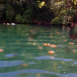 その後 ジュエリーフィッシュを見に 船から足元があまり良くない山道を5分くらい歩き クラゲのいる湖に到着。知らないでフィンソックスだけで山道を歩きましたが 足の裏が痛かったので 参加する方は 岩場があるので サンダルは必ず履いていったほうが良いです!