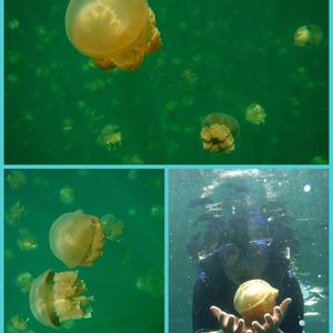 ずっと昔TVで観て、憧れていたジェリーフィッシュレイク♪しかし、その体験は体力との勝負で始まりました。ボートから下船すると急な坂道を上って上って下がって下がって、湖に到着。そこで既に足に笑いが起き始めていたのに、いざ湖に入水するも、ジェリーフィッシュは湖の反対側に多く生息しているとのこと。その感動をより味わうために、水面を視界に入れない“らっこちゃん泳ぎ”(仰向け)で移動しましょうとのアドバイスから500mをひたすらバシャバシャ腕を使って進んでいきました。息も絶え絶えやっとの思いで辿り着き、水中を覗いてみると…あぁ夢にまで見たクラゲクラゲクラゲの世界…思っていたより大きくてびっくり!手のひらより大きいくらいのクラゲをヾ(・ω・*)なでなで…かわいいかわいいかわいい…癒される癒される癒される…帰りも同じ距離を今度は普通の泳ぎでスイスイと。離れがたかったクラゲ~