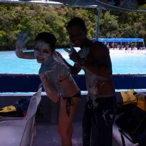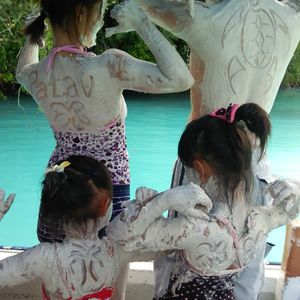 土砂降りの中で寒くて凍えそうだったけど、水がとても綺麗だし、泥をつけあうのはとても楽しかった。海は冷たくなかった。