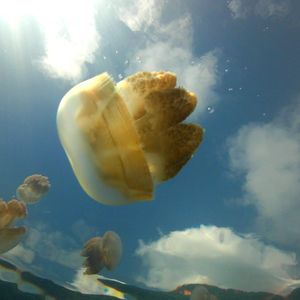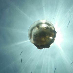 盛りだくさんのツアーでしたが、ジェリーフィッシュが一番良かったです。くらげがなついてきて気持ちよかったです。ただし、たどり着くまでにサンゴ礁の岩山を歩かなければならないのでくれぐれも歩きやすいサンダルで参加を(ヒールはない方がいいです)。下の写真は、ガイドさんが水中に潜って見上げるように撮影してくれました。ありがとうございました。