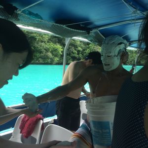 ガイドさんがもぐって泥をすくってきてくれ、泥パックの始まりです。泥の感触がとても気持ちよく、みんなで全身に塗りたくりました。その後、海に飛び込んで泥を落としましたが、コンタクトをしていたので、目の中に泥と海水が少し入ってしばらくゴロゴロして辛かったです。