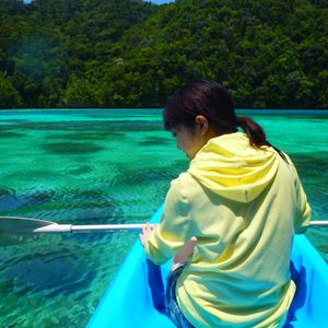 透き通った海の上にカヤックがあると、空中に浮かんで見えるんですね。