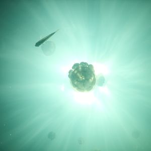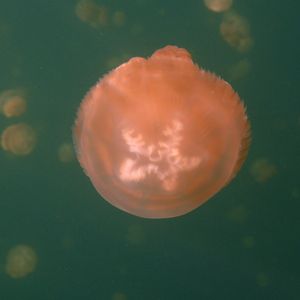 ガイドさんの「もういいよ」の声で潜ると、ものすごく幻想的な景色が!緑がかった水中にオレンジのクラゲが無数に漂う様は、何ともいえないキレイな色合いです。軽く触った感触もプヨプヨと気持ちいいです。