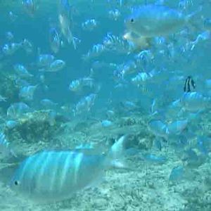 スタッフのかたがくれた、さかなのえさ(たぶん前の人たちの食べ残し^^;;???)をもって海に入ると、さかながたくさん寄ってきて、こどもはよろこんでいました。