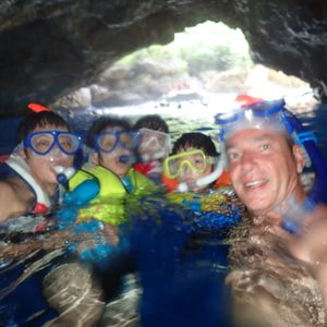 12月30日グロットへ。ジムさんと中ちゃんと一緒に家族5人で参加しました。このグロットは、ガイドなしではいかない方がいい場所だったので、ジムさんのツアーに参加できて、きれいな海を見ることができました。二度目のサイパンは、子供たちが大きくなり、グロットシュノーケリングを楽しむことができました。72歳のおじいちゃんが人生初のシュノーケリングをサイパンのグロットで体験し、素晴らしい経験ができたと喜んでいます。ジムさんのツアーは、他にもタポチョ山、禁断の島など、アレンジしてくれて、ナイスなツアーが盛りだくさんです。