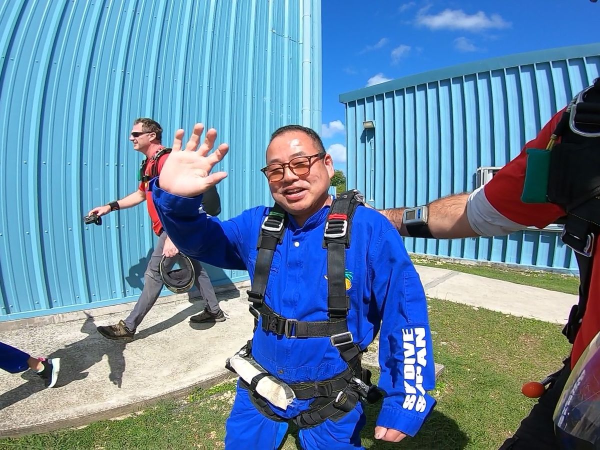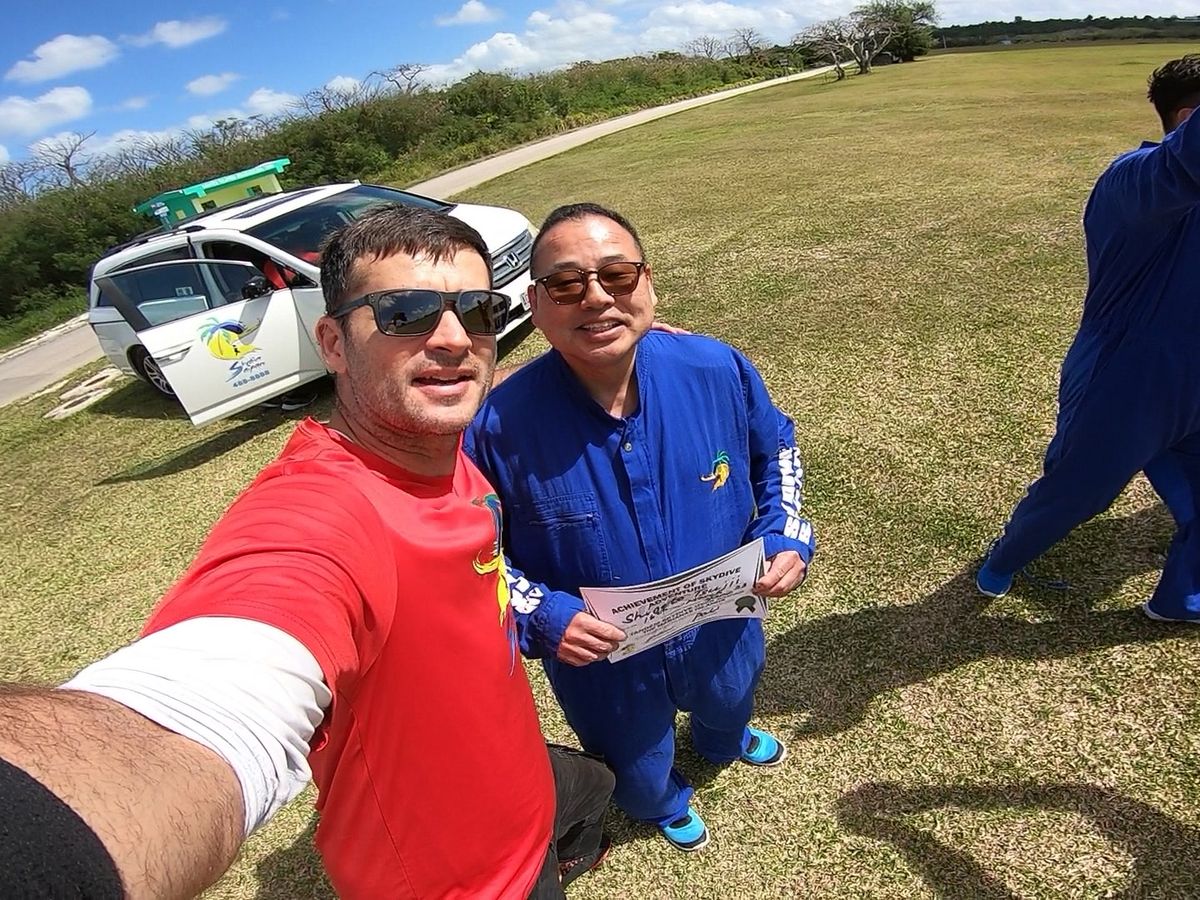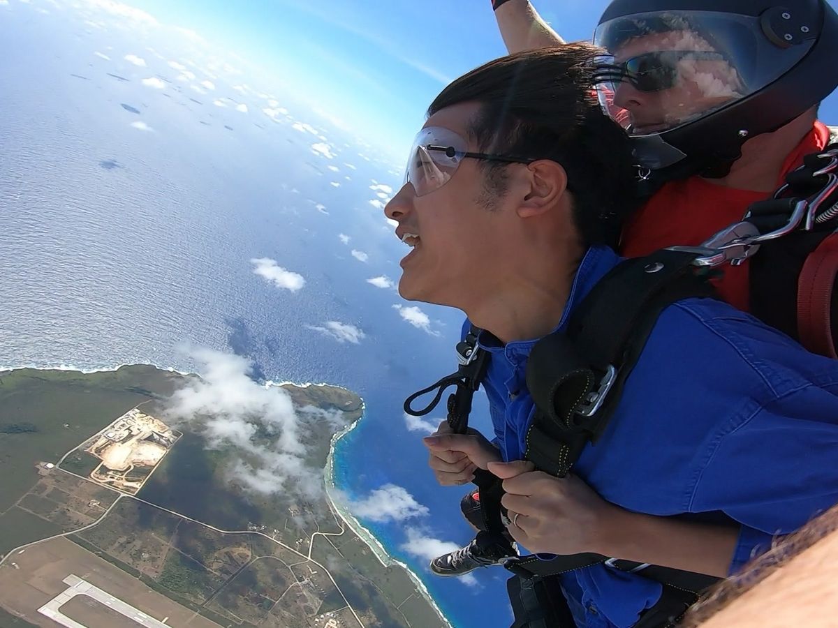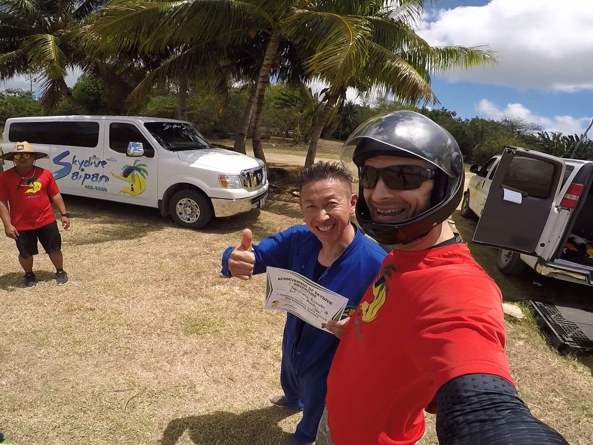 人生初のスカイダイビング体験。最高の思い出になりました。怖さはありましたが、しっかりと事前のレクチャーと準備があったので安心できました。飛行機から飛び出す瞬間は緊張感がありましたが、飛び出すとあとは素晴らしい落下体験に圧倒されるばかり、パラシュートが開いたあとはゆったりとサイパンの素晴らしい景色を堪能できます。最後の着地の瞬間は地面に叩きつけられそうなスピードがでますが、それもしっかりと脚を上げるようレクチャーを受けていたので、ちゃんと着地もできました。飛んだ後に証明書を発行してもらえるのも嬉しいサービスです。