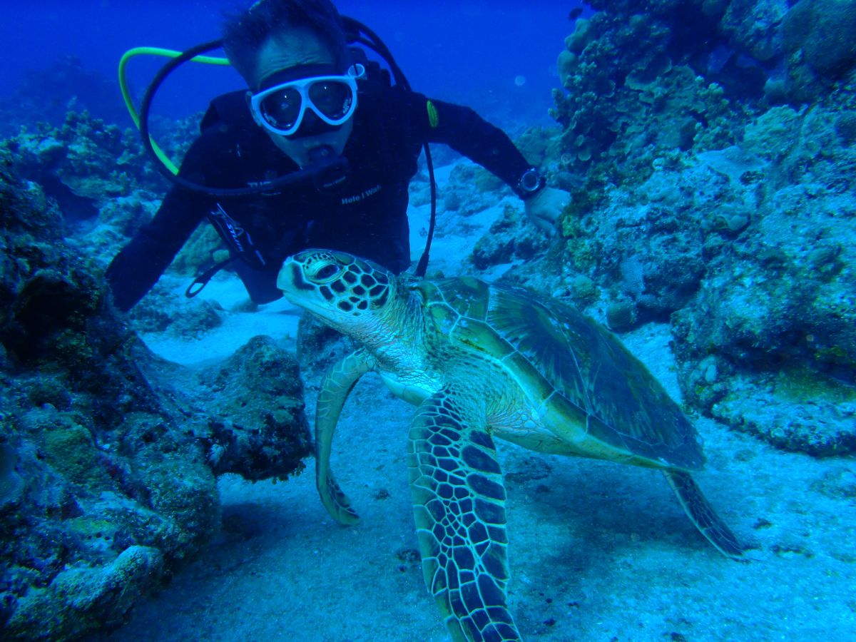 潜ってバブルを出してくれたり、たくさん写真を撮ってくれました。水中は噂通り綺麗な青で、底までよく見えます。