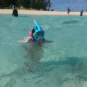 水がとても奇麗で、サンゴ礁には沢山の魚が見れます。足の着く範囲で沢山魚が見れますので、シュノーケル持参がお薦めです。レンタルも可能ですが