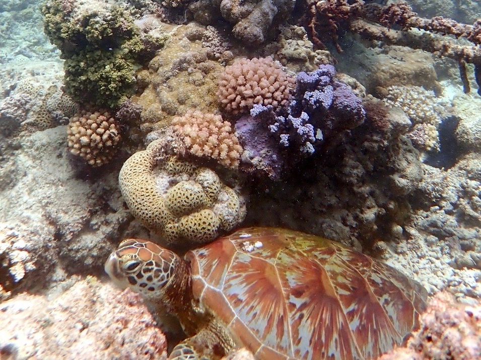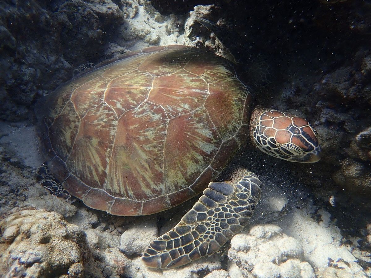 二本目は東側のラウラウビーチというところで、あ10mくらいまで潜ります。ビーチから体感50mくらいタンクを背負って歩いて、そこからはロープを伝って海底へ。運がいいとウミガメが見れるのですが、私は運良く見れました。インストラクターさんが色々発見してくれて見せてくれます。また、写真も撮ってくれるのでいい記念になります。