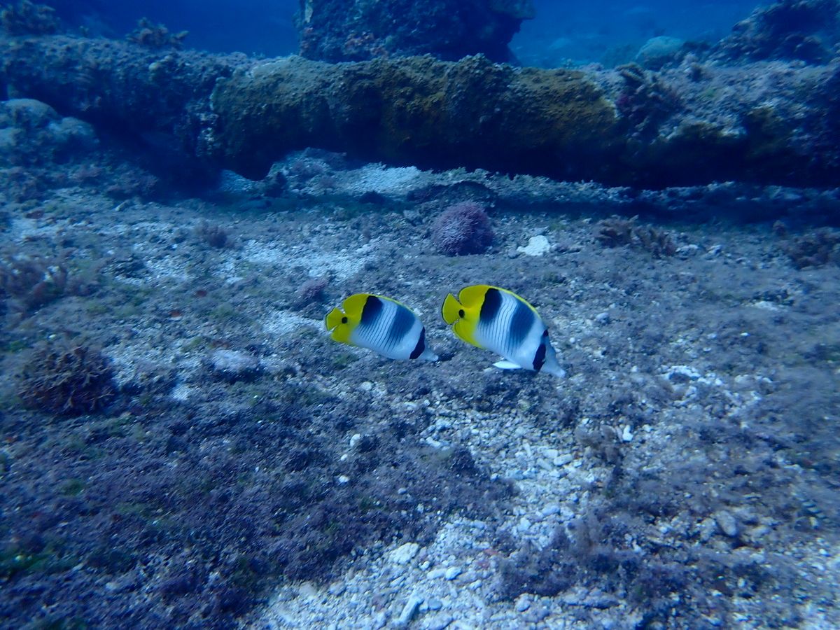 一本目は西側のシュガードックという浅いところで耳抜きやマスクの水の出し方、レギュレーターの再装着を学びながら南国の魚を見る初級編という感じ。