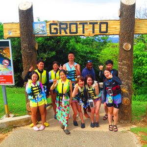 私たちはマリアナリゾートに宿泊していたので、歩いてもすぐの距離でしたが、なんとなくテンションの上がる!?バギーでロビーまでお迎えに来て下さり、とりあえずマリアナストレッキング様のオフィスに集合。(こんなに近距離にオフィスを構えていらっしゃるとは知らず予約していましたが、マリアナに泊まっていた私たちにとっては好都合でした)この日は確か全員で10名以上の参加者がいらっしゃったと思いますが、ポイント、ポイントで満遍なく写真を撮影して下さいます。水中での様子もグループごとに何枚も撮影して下さり、ツアー終了後オフィスに戻ってから、上映会が開かれました。その際に出来たての暖かいポップコーンを出して下さり、とても美味しかったです。グロットはとても美しく神秘的な空間でしたが、奥の方が狭くなっているうえ、他のツアーの方々もわんさかいらっしゃって混み合ってしまったのが少し残念でした。帰りにこちらのオフィスでマニャガハ島ツアーも予約させて頂き、大変お世話になりました。