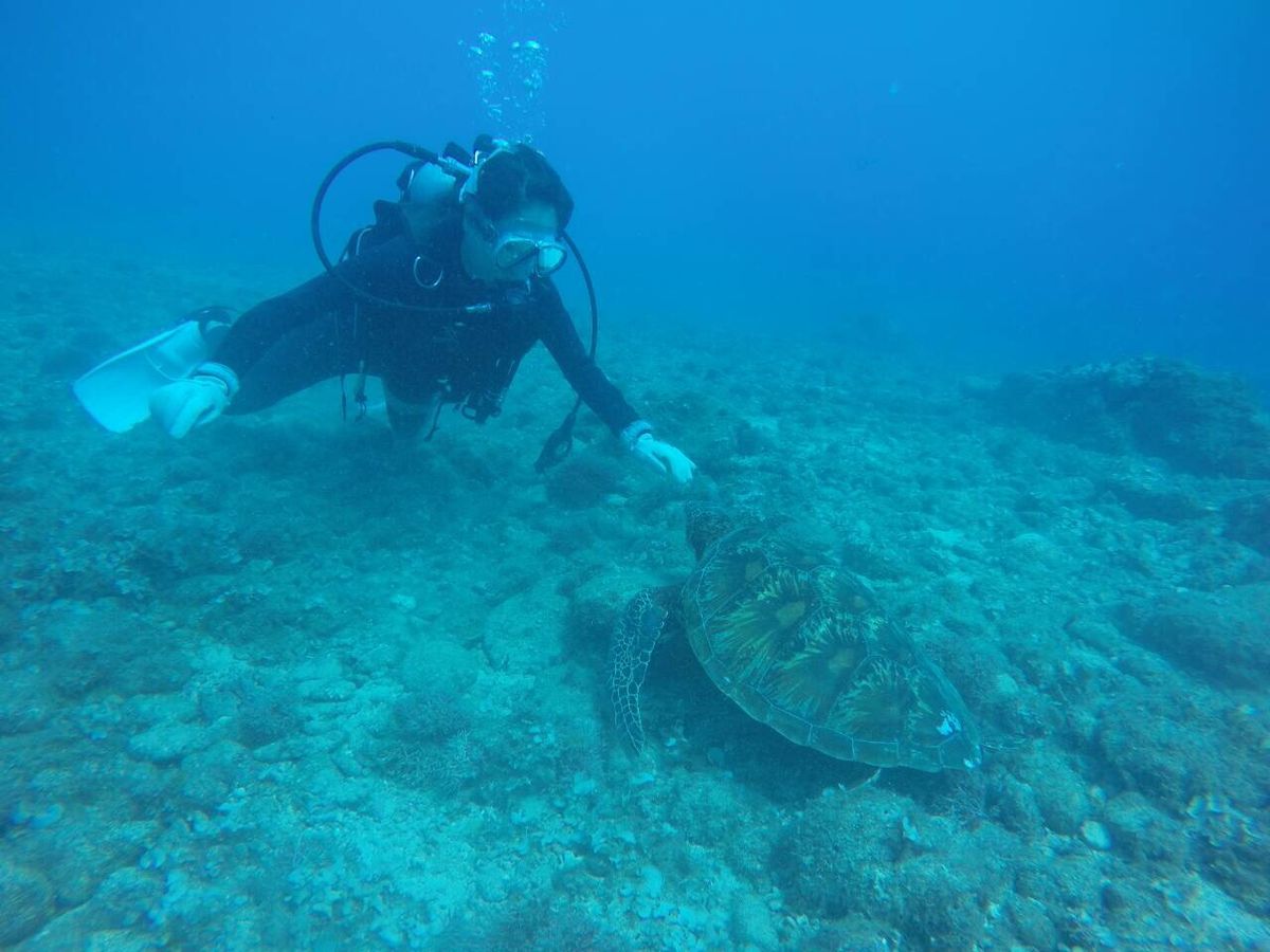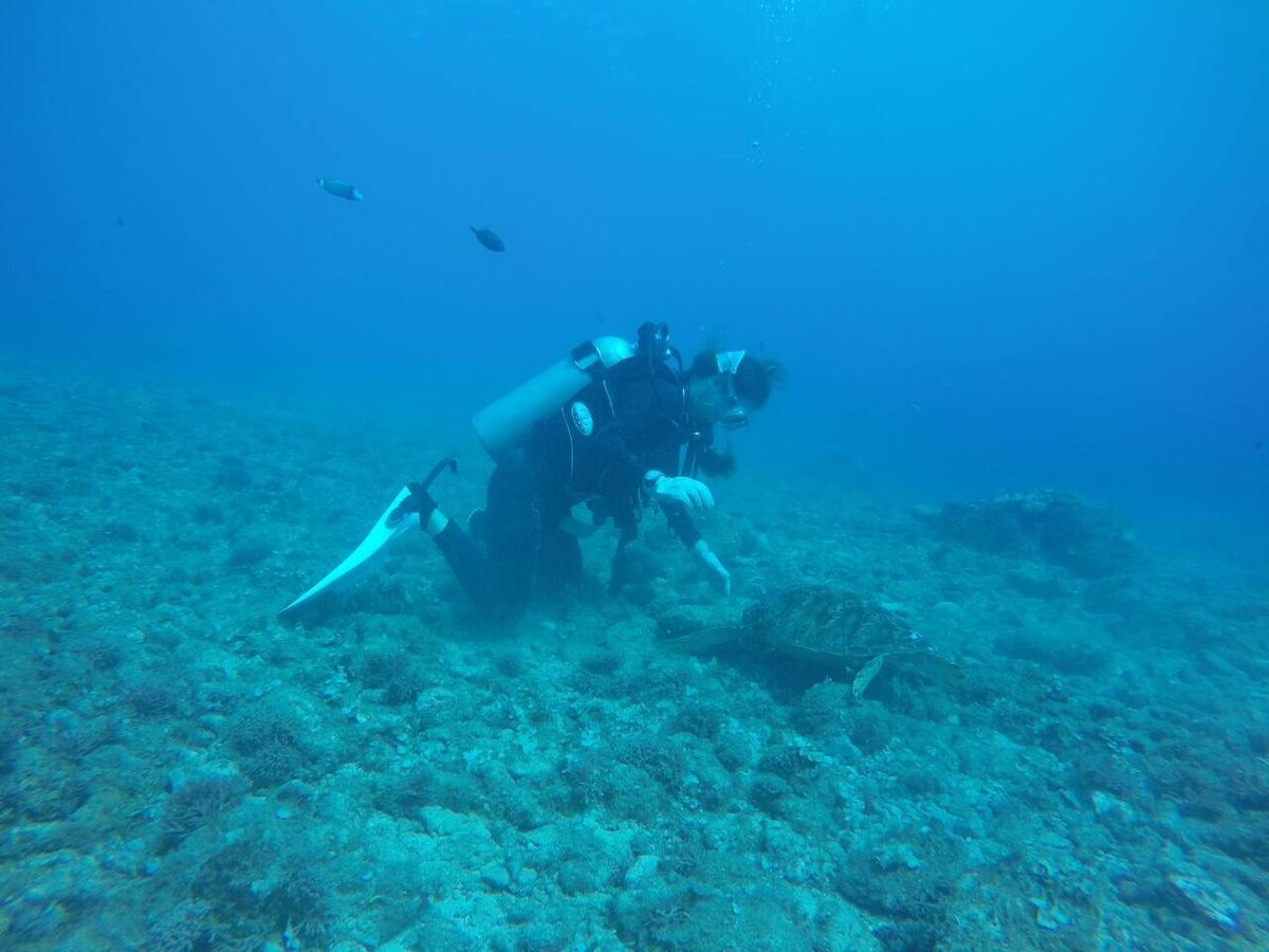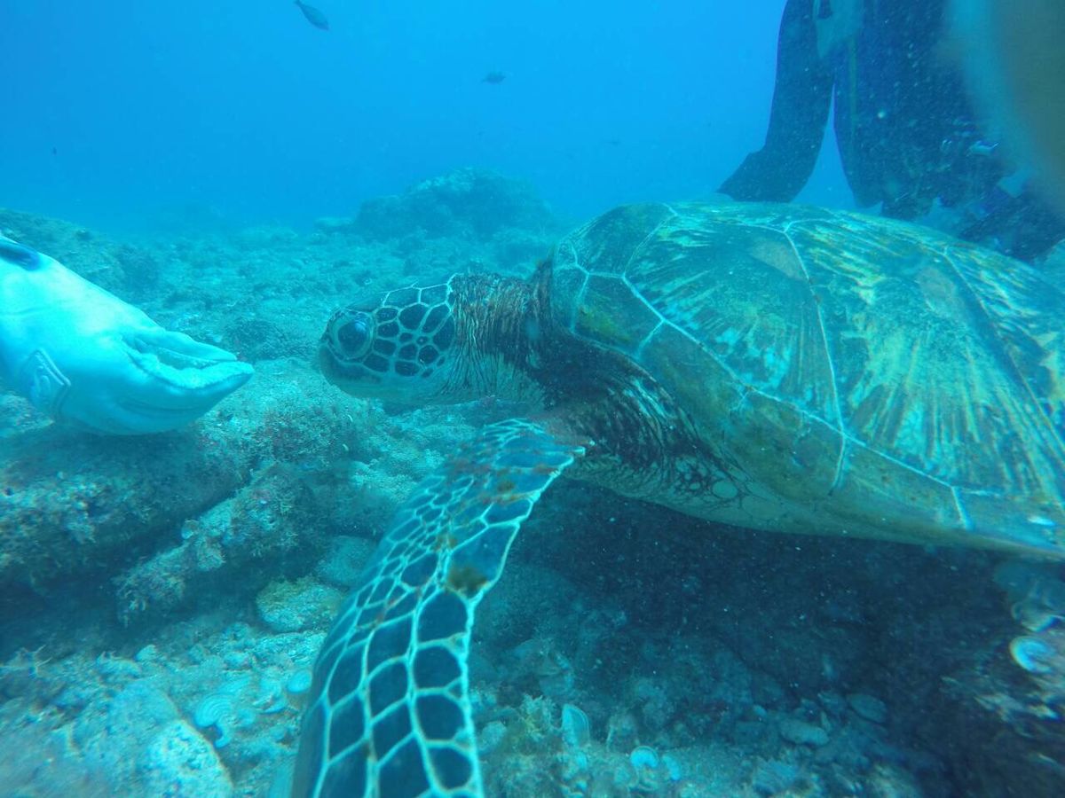 実習のダイビングでも、タコと遊んだり、ウミガメやアジの群れも見られて、